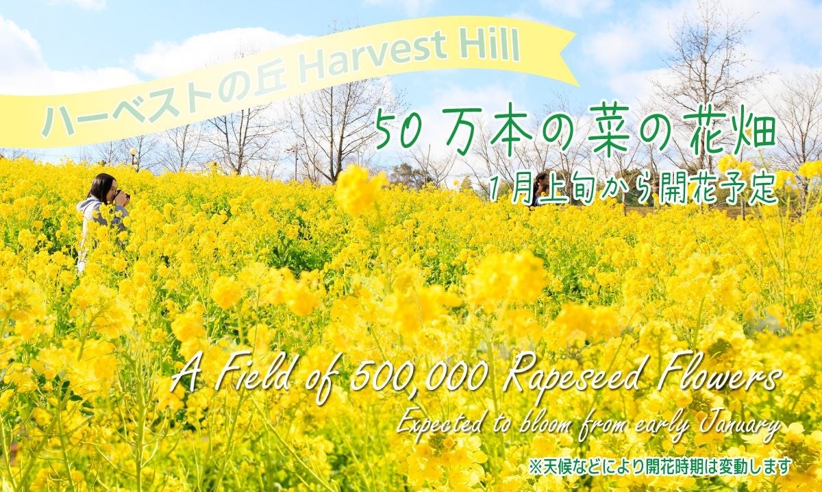冬空の下、黄色い菜の花が花畑一面に咲き乱れます。