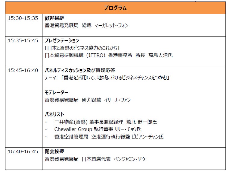 当セミナーではさらに、「香港を活用して、地域におけるビジネスチャンスをつかむ」をテーマとしたパネルディスカッションの中で、三井物産(香港)有限公司等と現地企業が急成長を遂げるヘルスケアビジネスからグリーンビルディング、物流ビジネスなど多岐分野におけるビジネス機会を探ります。