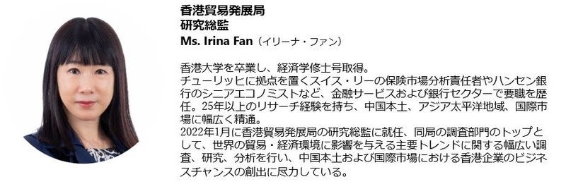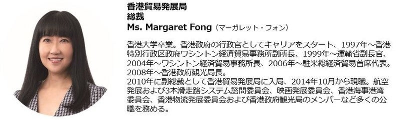 オンラインセミナー開会の挨拶では、2018年の来日時に日本の中央省庁、地方自治体、関連企業団体の重慎を表敬訪問した香港貿易発展局方舜文(マーガレット・フォン)総裁が、日本企業の皆様へ特別な思いを語ります。