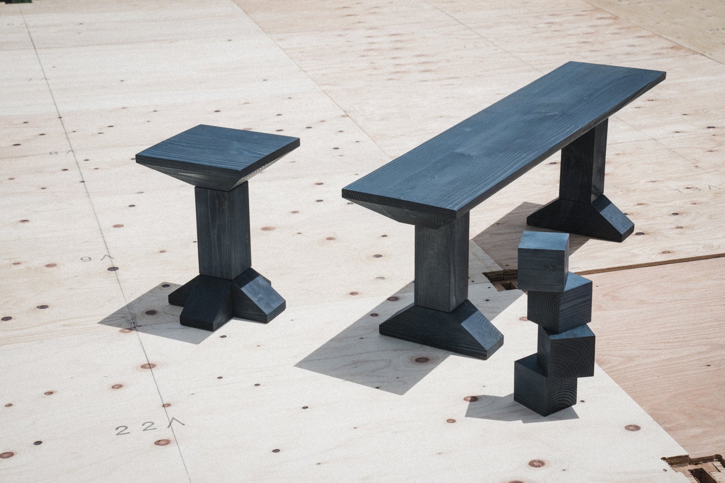 湾曲した根元や主材料の端材などを丁寧に繋ぎ合わせ、藍染めを施し、素材全体の表情を統一することで、本来利用価値の低い良質な無垢材を有効活用し、新たな木材の市場価値と巡回を生み出すサステナブルな家具づくりを目指している。