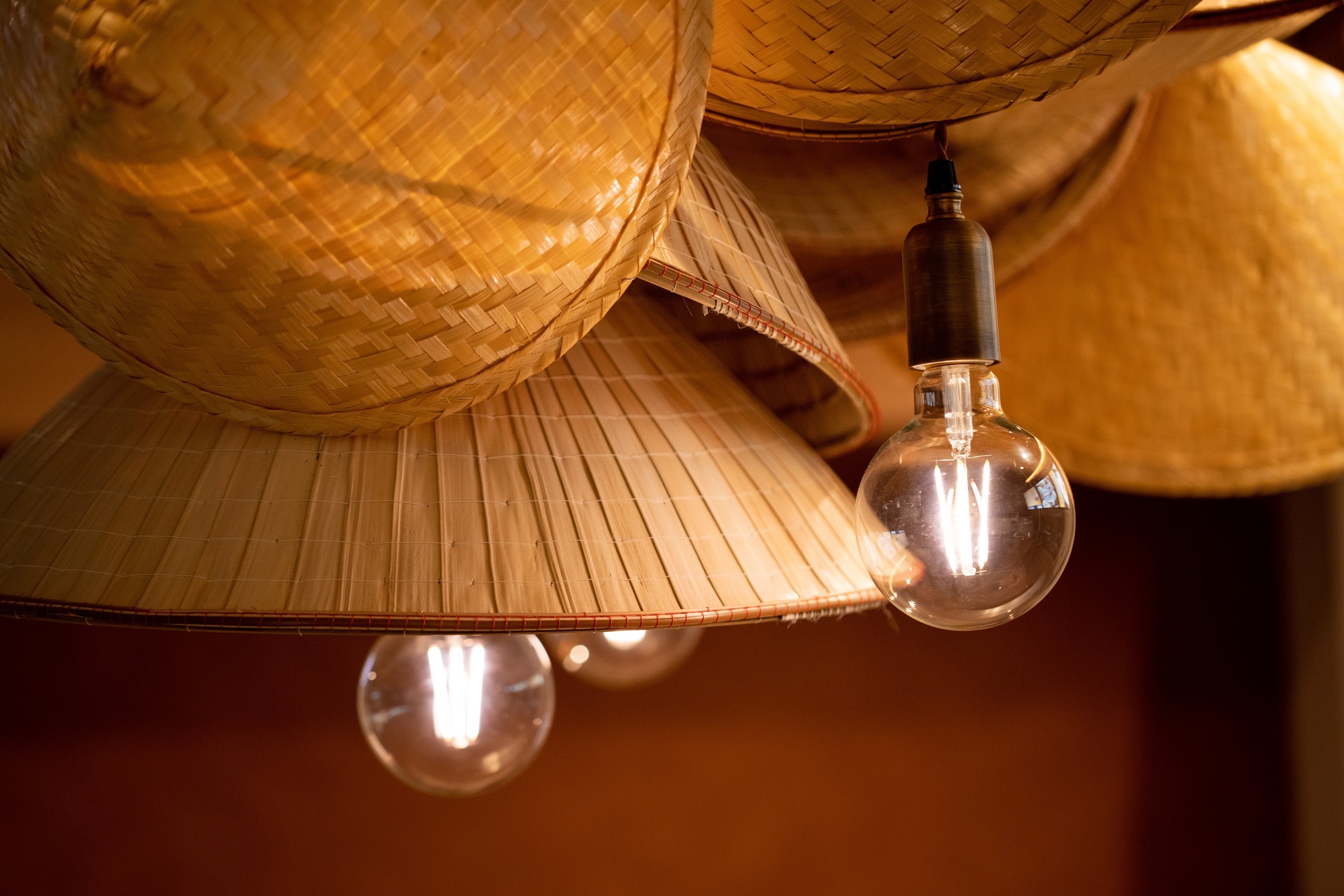 外観から見てもインパクト大のシンボリックに飾られた中央のオリジナル照明は現地から仕入れたベトナムの笠で作られたオリジナルです。