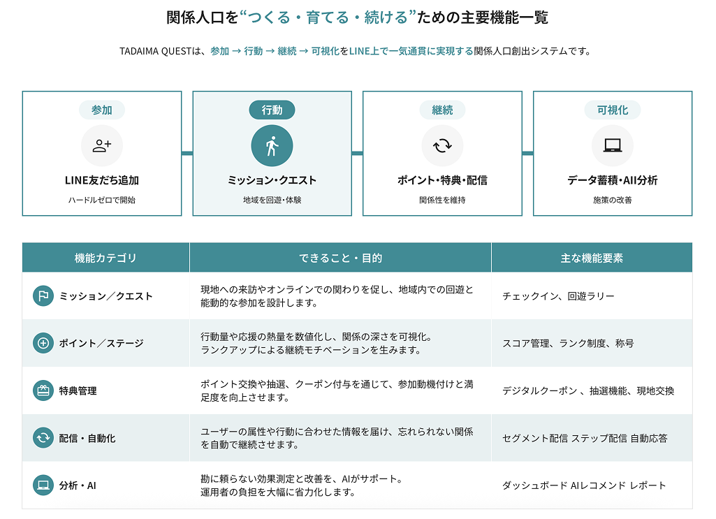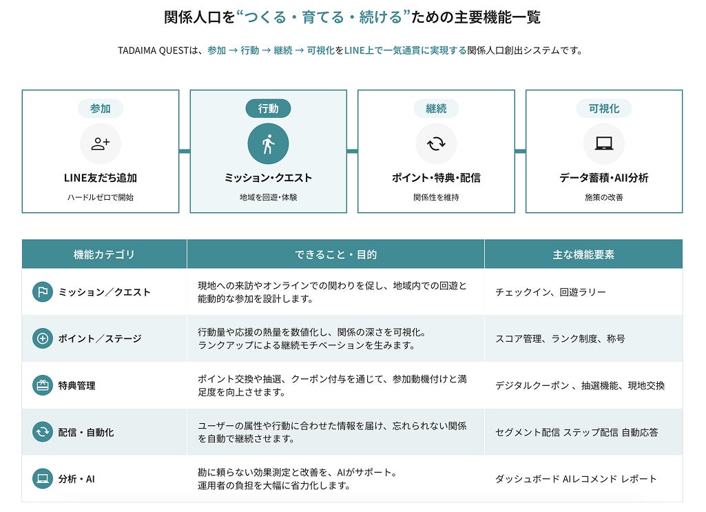『TADAIMA QUEST』は、制度の前に不可欠な「地域への愛着」と「関わり続けるきっかけ」をデザインし、旅の終わりを「関係のはじまり」に変える仕組みを提供します。