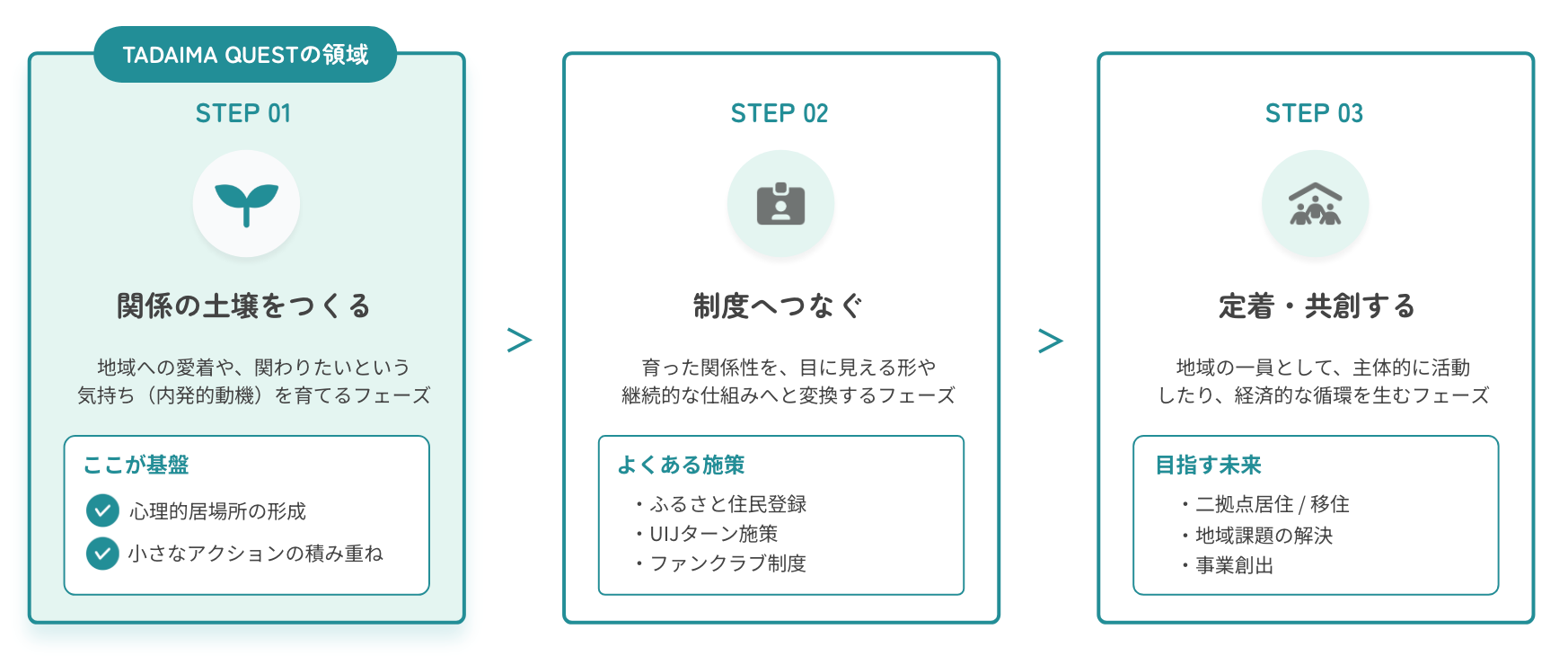 『TADAIMA QUEST』が担うのは、まさにこの「関係の土壌をつくる(STEP 01)」フェーズです。 来訪者がどこに興味を持ち、どのように関わり、どれほど地域に愛着を感じているのか。 これらを可視化し、内発的な動機を育てることで、一過性の「観光(交流人口)」を、持続的な「関係(関係人口)」へと昇華させます。