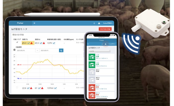 当社は、養豚業に関わるデータを一元化・分析し養豚経営判断をサポートするICTソリューション「Porker」及びIoTセンサー(飼育環境測定器)を提供することで生産量向上の実証を行うとともに、各種ハードウェアとのデータ連携基盤の開発を行いました。
