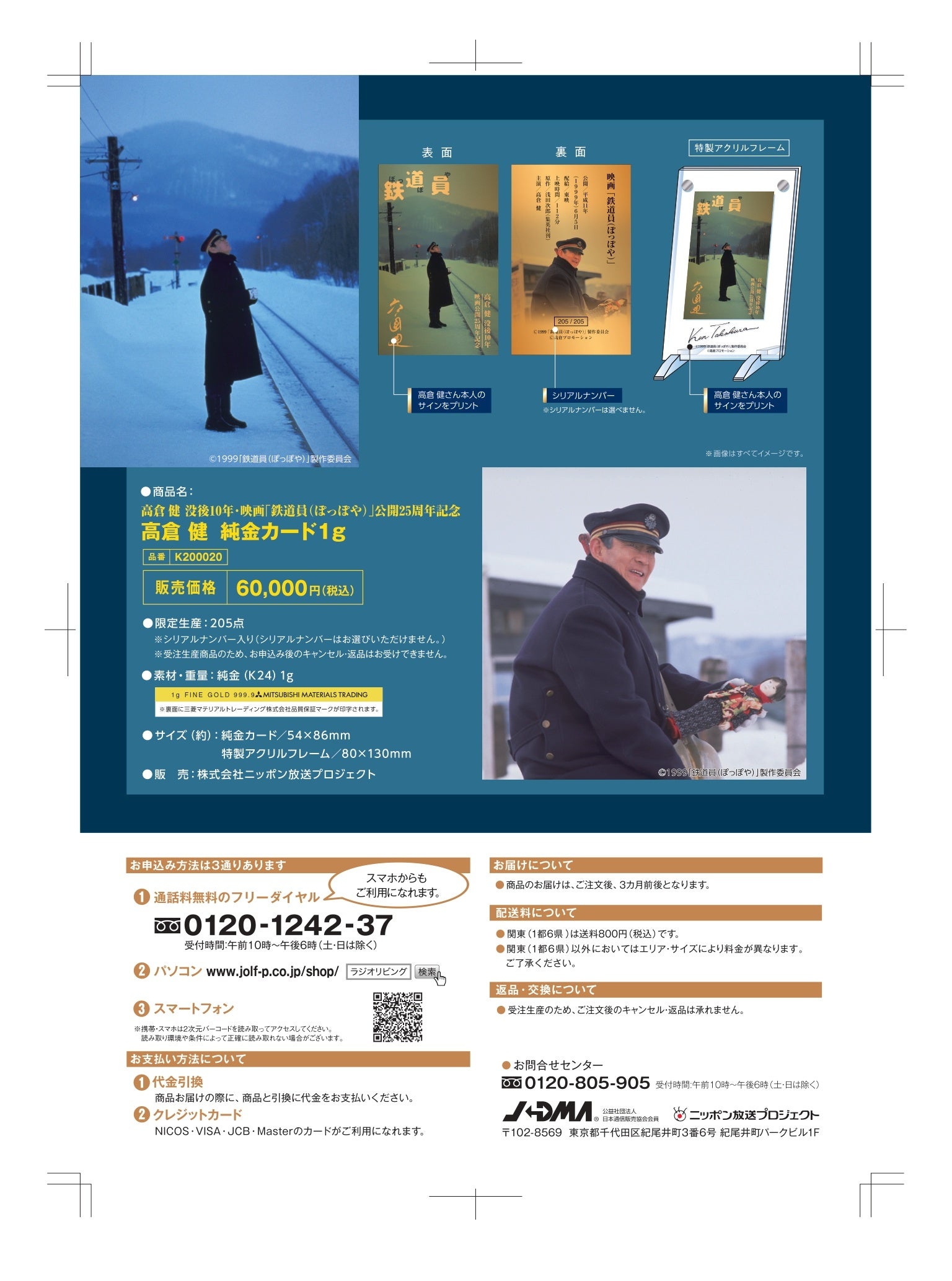 株式会社ニッポン放送プロジェクトは高倉健さんの没後10年と映画「鉄道員(ぽっぽや)」公開25周年を記念して、「高倉健 純金カード」を発売いたします。