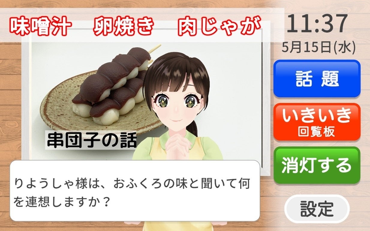 「星輝しおり」は、介護福祉士を目指す3Dバーチャルアシスタントの「星輝しおり」が、タブレット端末を介して在宅高齢者の日常生活を支援するデジタルコミュニケーションサービスです。ご自宅、施設にお住まいの高齢者に寄り添い、毎日、変化に富んだ会話を重ね、頭や身体を動かして楽しい時間を過ごしていただくことを目指しています。特に、生成AI を活用した会話機能は、人と話しているような自然な会話を楽しめ、「星輝しおり」からも話題を提供します。発話内容を字幕で、返答のヒントをテロップで表示し、高齢者の会話がスムーズにつながるようにデザインされており、毎日の会話量と頻度アップを支援します。