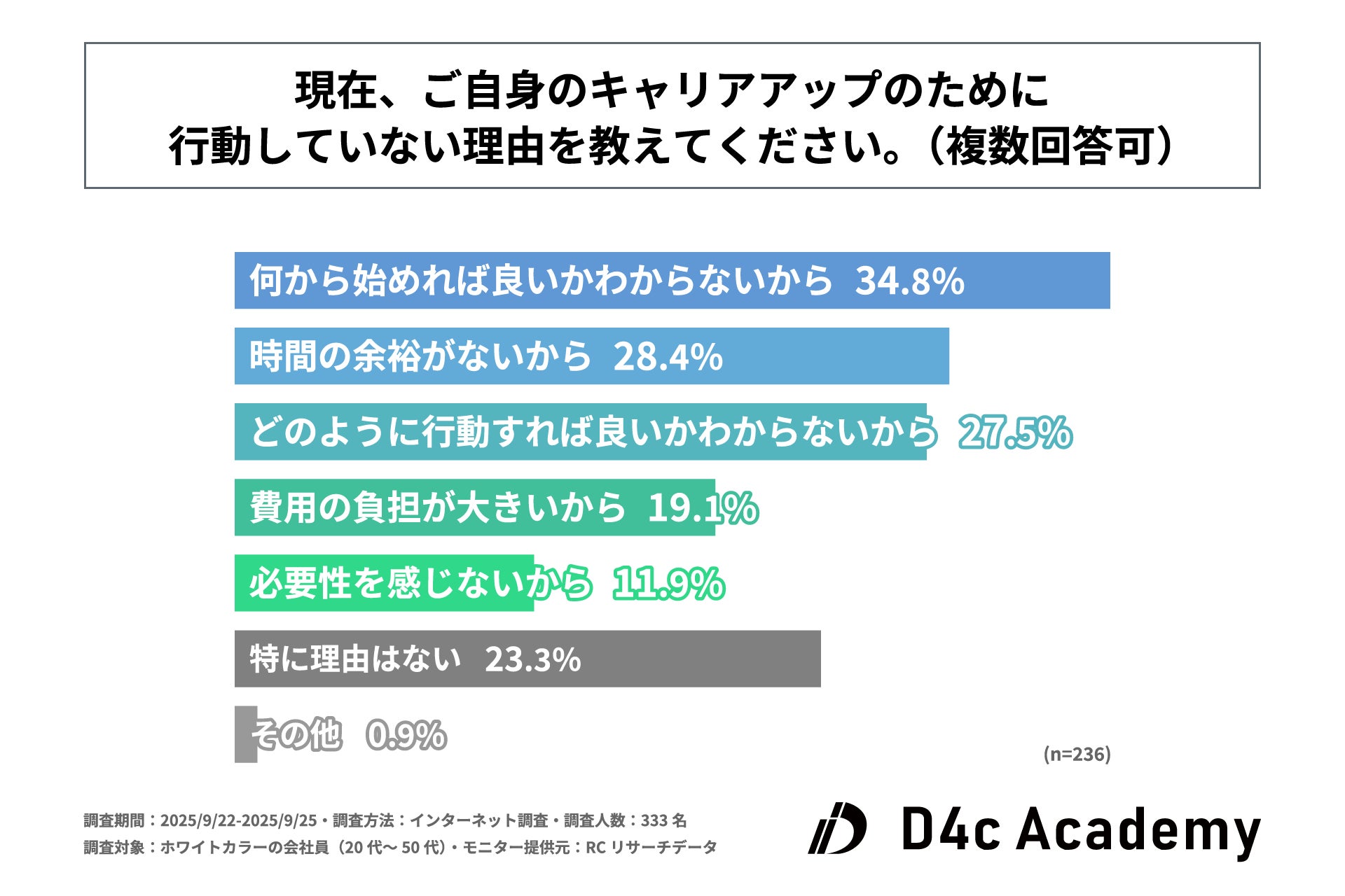 調査の最後、自身のキャリアアップのために行っていることは「ない」と回答した人を対象に「現在、自身のキャリアアップのために行動していない理由」を尋ねる設問への回答では、1位が「何から始めれば良いかわからないから」で34.8%、2位が「時間の余裕がないから」で28.4%、3位が「どのように行動すれば良いかわからないから」で27.5%という結果になりました。この結果から、現在自身のキャリアアップのために行動していない人のその理由として最も多いのは、「何から始めれば良いかわからないから」であることが明らかになりました。