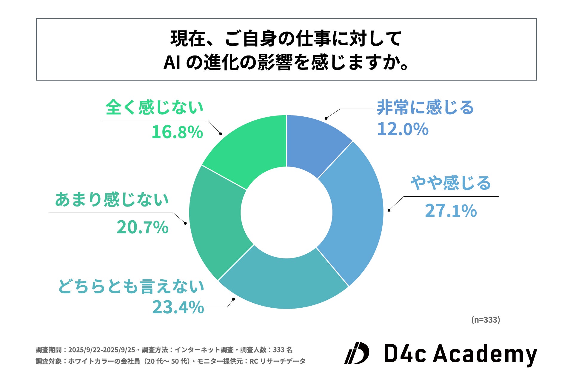 ホワイトカラーの会社員の約4割が、現在自身の仕事に対してAIの進化の影響を少なからず感じている