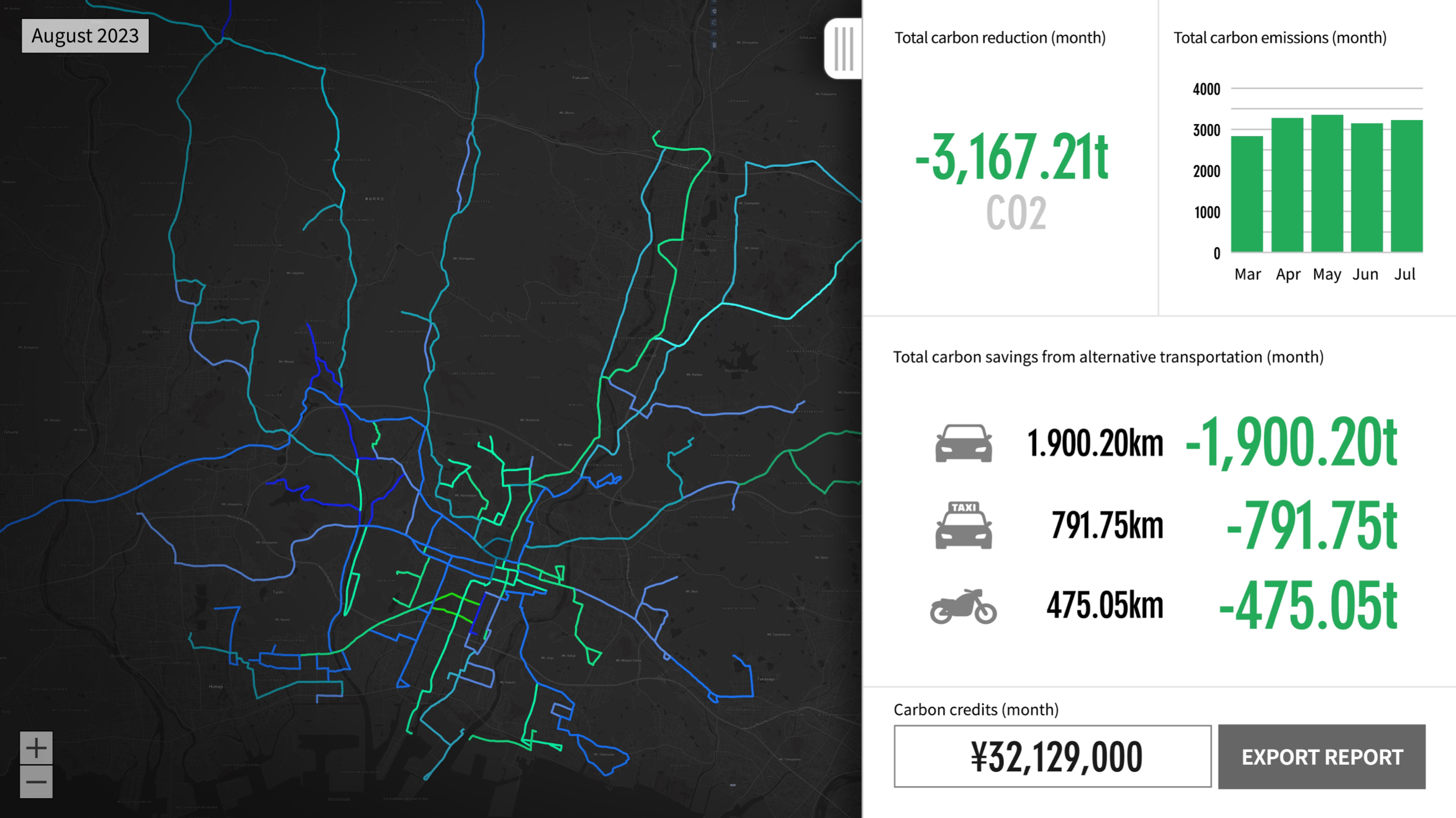 Spatial Pleasureでは交通領域の脱炭素施策の提案、及びカーボンクレジットを行うdMRV(digital, Measurement, Reporting, Verification)ソフトウェアを開発しております。バスやシェアサイクル事業者様と連携し、各交通事業者様の環境便益の定量化によるカーボンクレジット発行を通して、地域全体の脱炭素化を目指しています。現在の都市は40%が交通インフラ、つまり道路や駐車場が占めており、私たちにとって何の意味も価値も生み出さない空間です。交通カーボンを基軸とする外部性の定量評価を通した都市再最適により、駐車場が公園に、道路が喫茶店やバーに、私たちの生活にとって意味のある空間へと変容します。