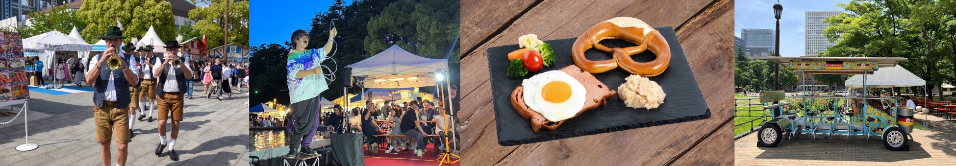 ▲左からディー・キルヒドルファのマーチング、大道芸、ミュンヘンプレート、ビアバイク