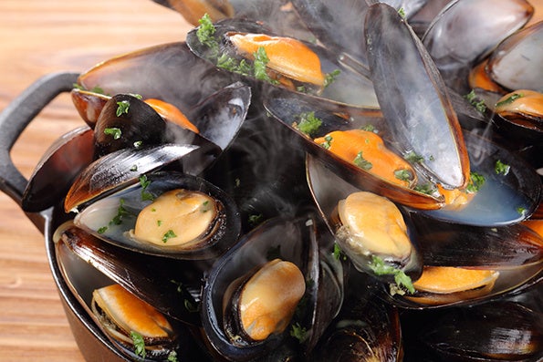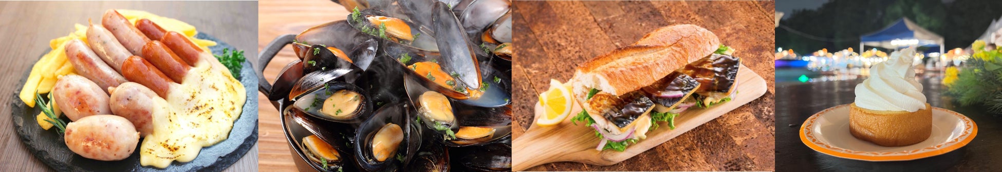 ▲左からソーセージ、ムール貝、サバサンド、バウムクーヘンパフェ