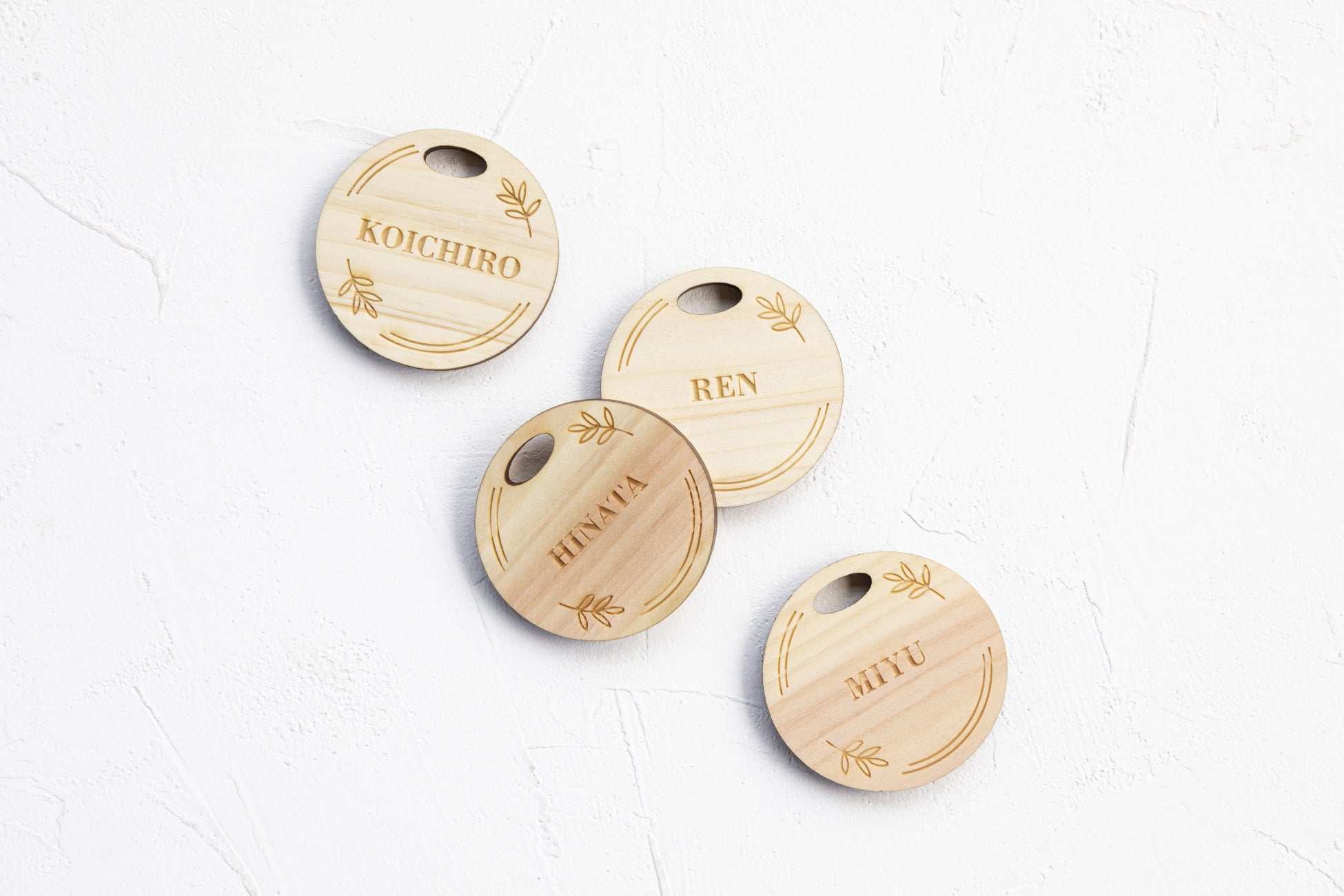 特別な想いを伝えるギフトとしての価値を高め、また貰った後も長く使用頂けるように、ヒノキ素材のウッドタグを採用。お客様ご希望のお名前を1つ1つ刻印しお届けいたします。
