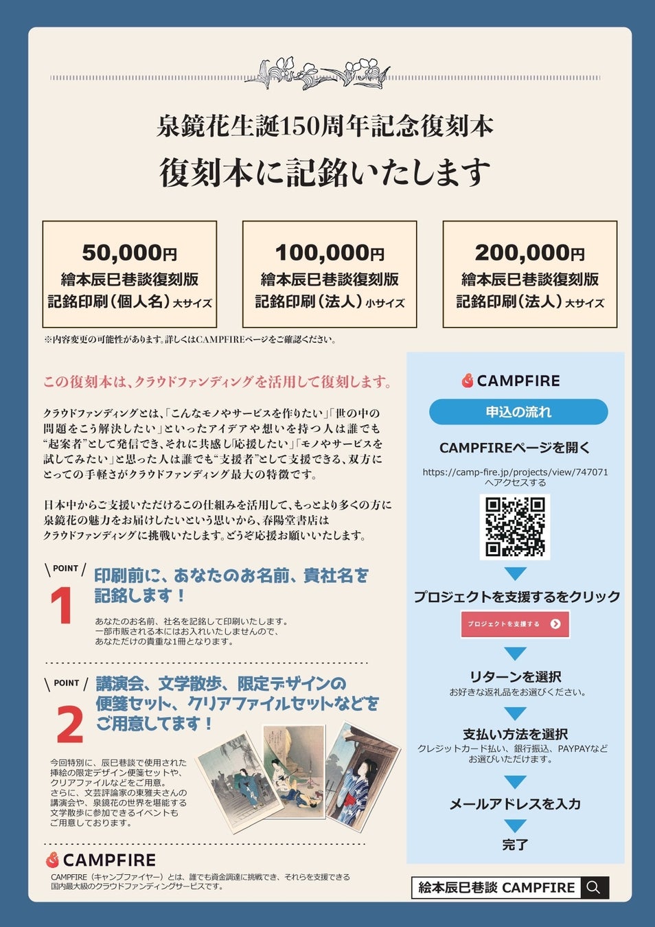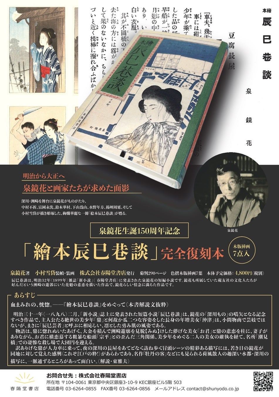 株式会社春陽堂書店(本社:東京都中央区銀座)は、<泉鏡花・生誕150年>を記念し、鏡花の名作『繪本辰巳巷談』をクラウドファンディングによる支援のもと復刻いたします。