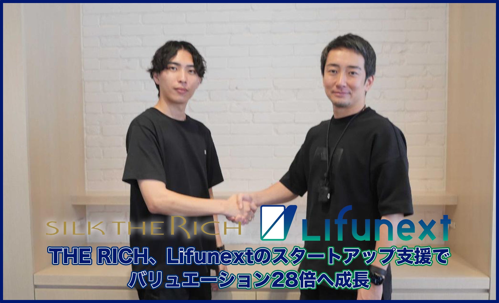 株式会社Lifunext(本社:東京都渋谷区、代表:田村 一将、以下Lifunext)は、シルクの魅力を発信する製品「SILK THE RICH」の販売を行う株式会社THE RICH(本社:東京都渋谷区、代表取締役社長兼CEO/founder 三浦裕太、以下THE RICH)に対して事業支援を行った結果、支援開始からわずか1年半でバリュエーションが約28倍になり、売上前年同月比4万%を達成したことをお知らせします。