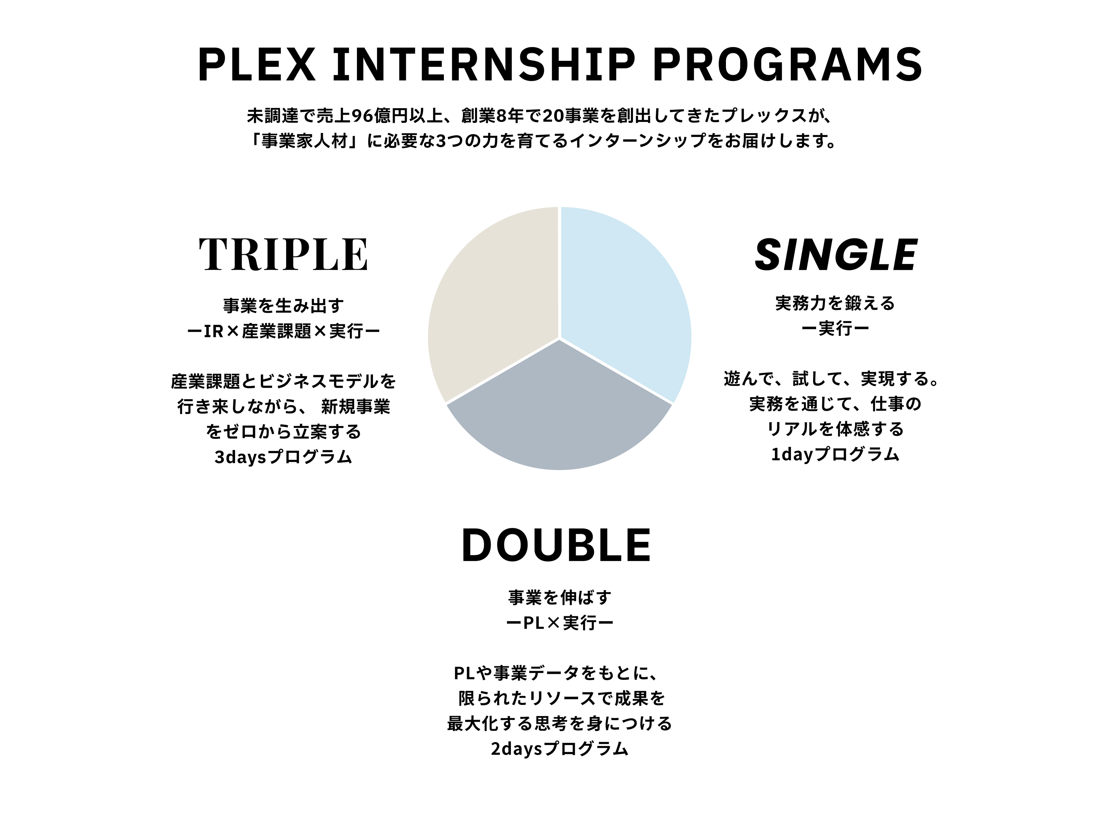 PLEX INTERNSHIP PROGRAMSでは、事業家人材に必要な3つの力を育成するため、TRIPLE(3days)・DOUBLE(2days)・SINGLE(1day)の3つのプログラムを用意しています。