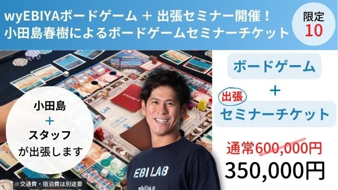 本体1セットと小田島春樹&EBILABスタッフによる【出張の】リアル開催のボードゲームセミナーチケットがセットに!企業研修として使っていただけるチケットです。また、これから起業したい仲間と一緒にDXについてゲームを使いながら学ぶ事も!