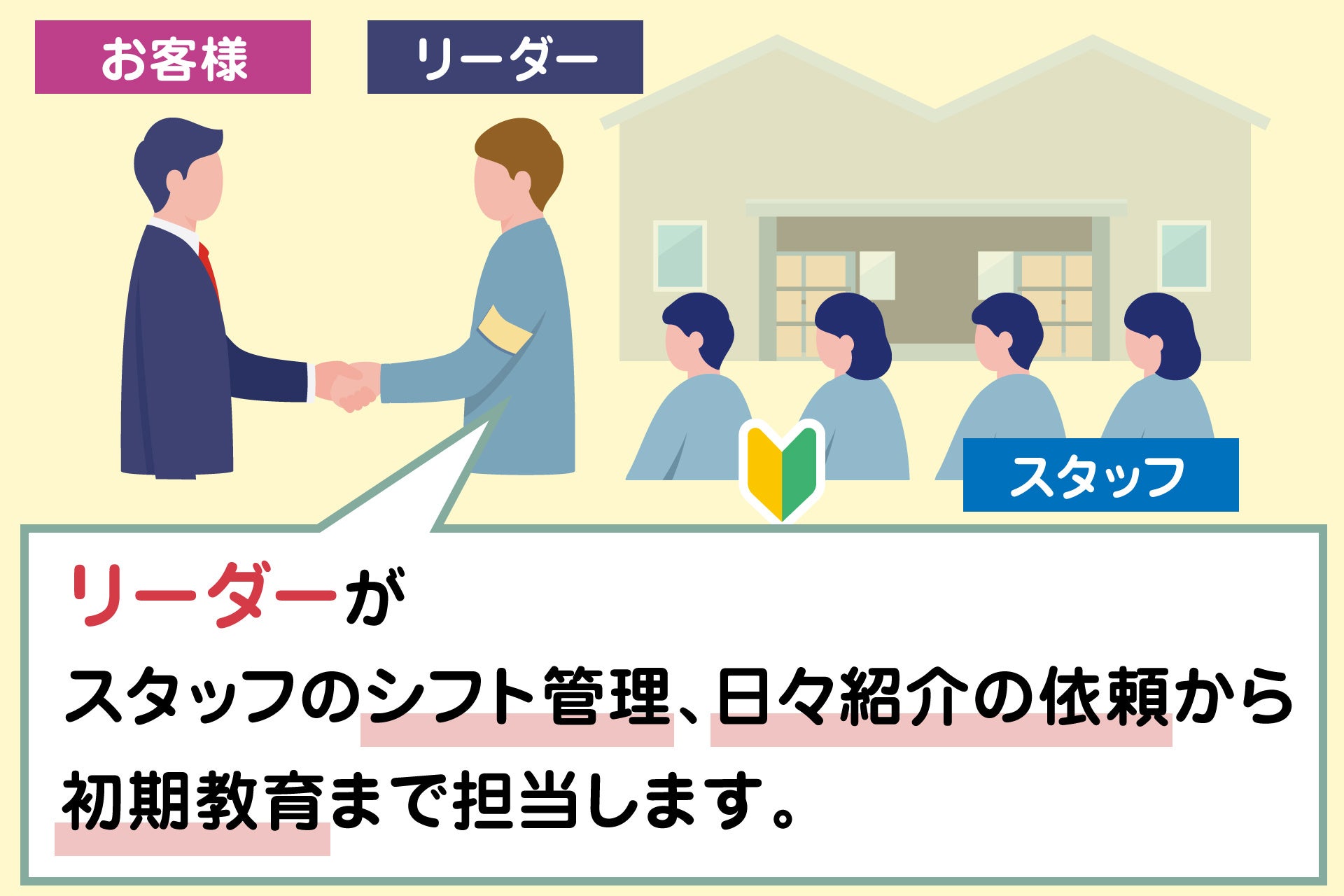リーダーの配置により発注からアテンド、初期教育、指示まで担当者の業務をサポートできる