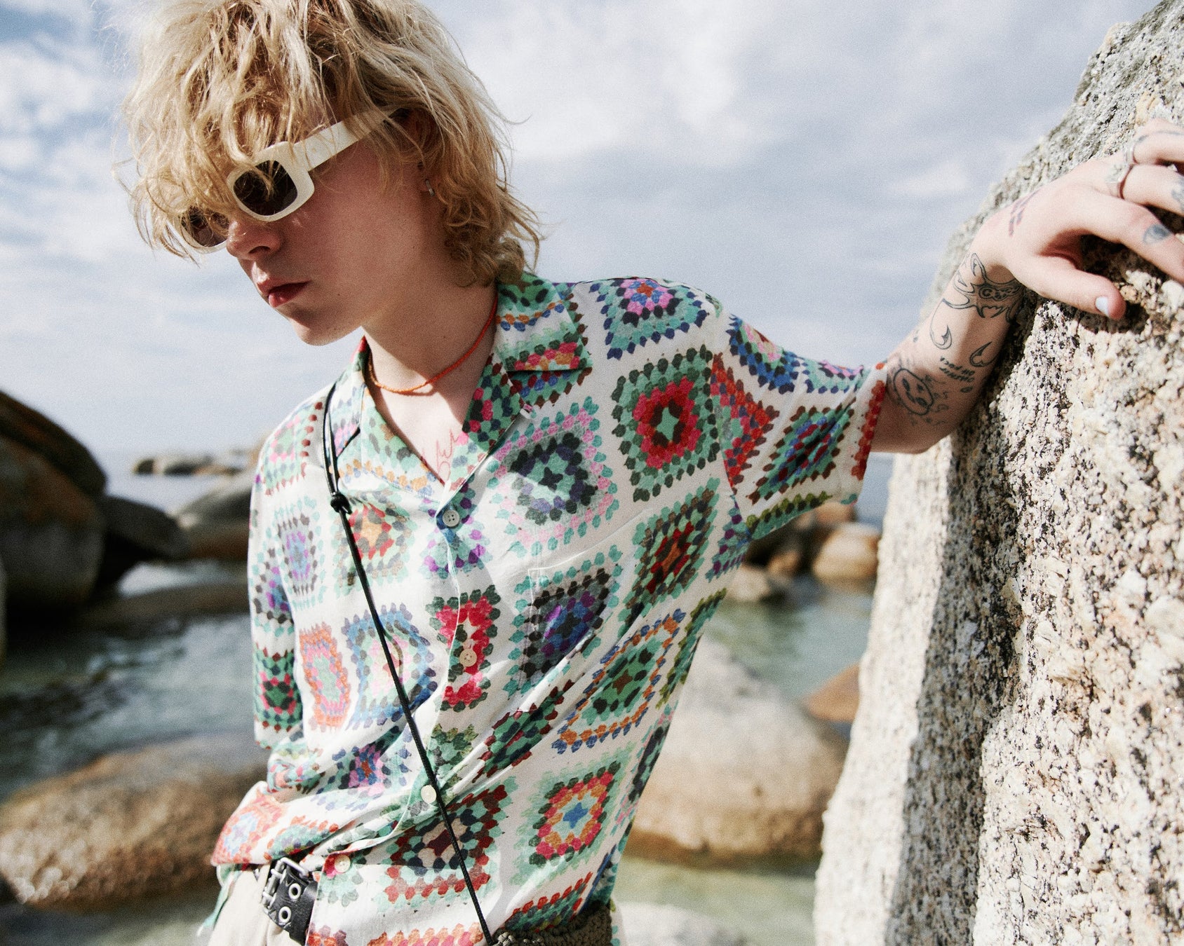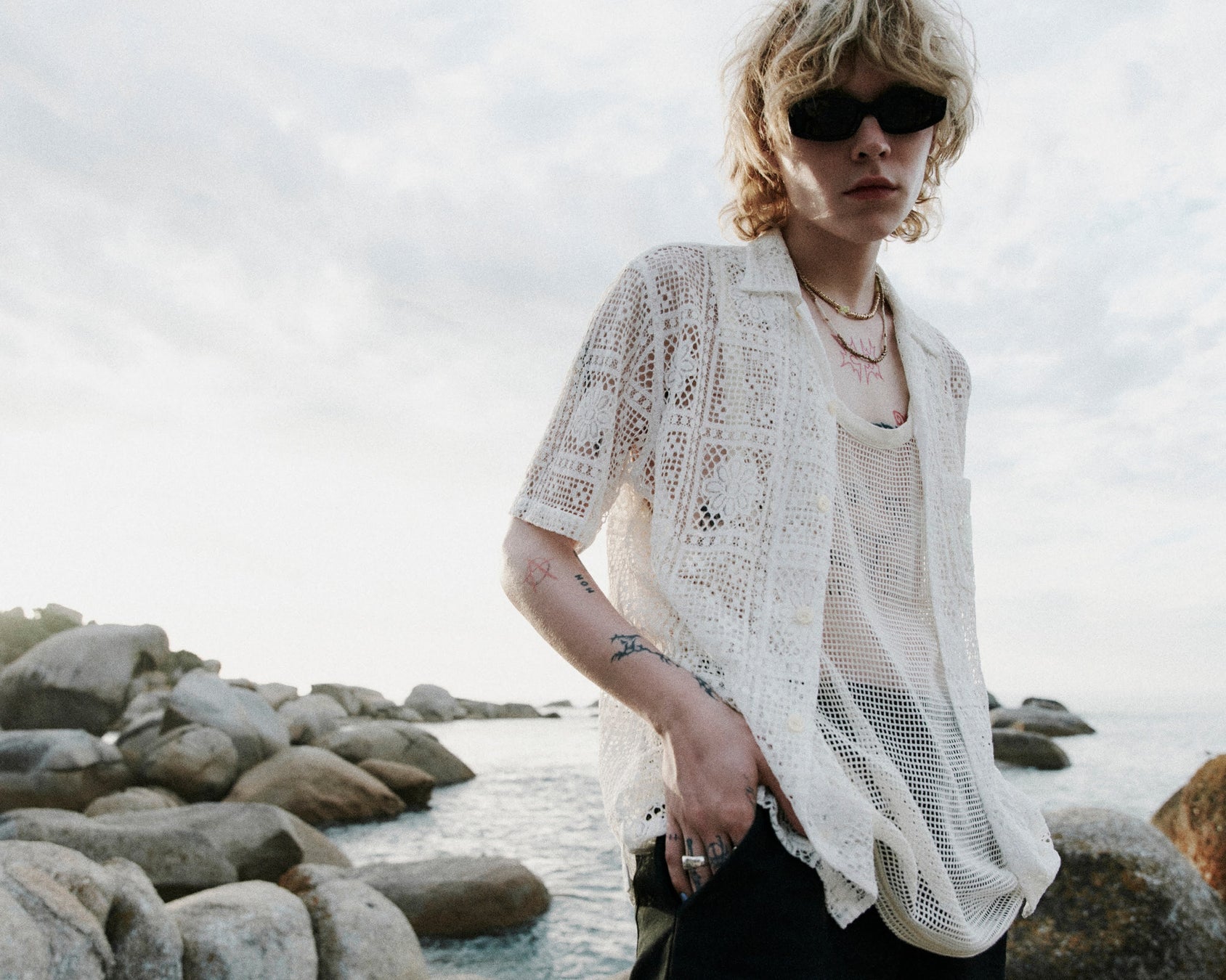 メンズコレクションは、様々なプリントのハワイアンシャツや、繊細なレースのシャツなど、着こなしの主役になるアイテムラインナップとなっています。90年代カルチャーを熱狂させた楽曲Come Togetherからインスパイアされた「LLONGA」レースシャツは、白いクロシェ編みレースで作られた爽やかなシャツで、夏のパーティやその他さまざまなオケージョンにぴったりです。70年代の楽曲All Tomorrow’s Partiesシリーズからは、当時のイビザを思わせるレトロなクロシェプリントやレオパード柄のアロハシャツが登場しています。シックな黒レース編みの「CALA」シャツや、虎柄がプリントされた「WILDCAT」シャツは、イビザ島の中でも最新のクラブHiにて大人気のDJイベントBlack Coffeeをイメージし、ヨーロッパの石畳の街で着用するようなコンテンポラリーなアイテムとなっています。同じくクラブAmnesiaで行われるPlanet Paradiseというイベントに着想を得た「MALLORCA」シャツは、ビーチでのリラックスした時間をアップデートしてくれる、鮮やかな花柄のシャツです。美しい夕日や炎を使った夜のドラムパフォーマンスが有名なビーチCala Benirrasからは、黒地に赤い炎をイメージしたプリントが施された「MESQUIDA」シャツが、雄大なイビザの自然を想起させます。