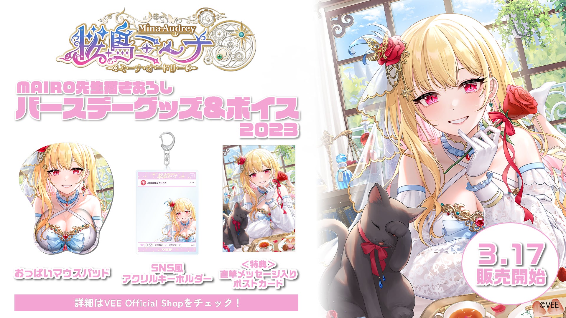 本日・3月17日、誕生日を迎えた桜鳥ミーナのバースデーグッズの詳細を公開するとともに、公式オンラインショップ「VEE Official Shop」にて受注販売を開始しました。