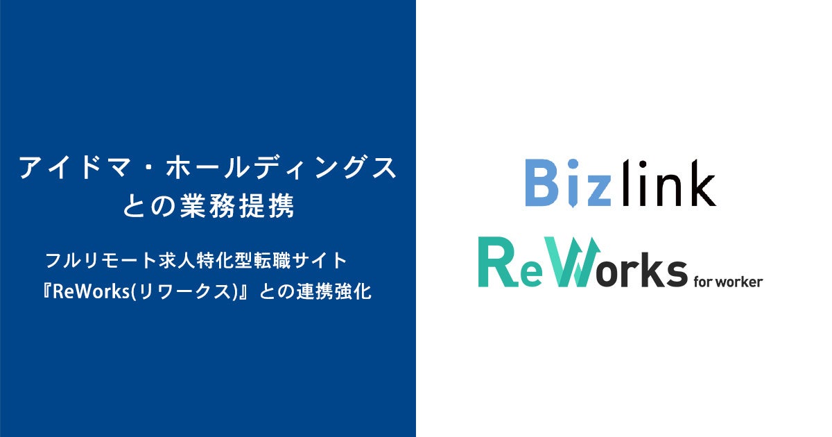 ITプロ人材のマッチングプラットフォーム「Bizlink(ビズリンク)」を運営する株式会社ビズリンク(本社:東京都品川区、代表取締役社⻑:姜 大成、以下「ビズリンク」)は、フルリモート求人特化型転職サイト『ReWorks(リワークス)』を運営する株式会社アイドマ・ホールディングス(本社:東京都豊島区、代表取締役:三浦陽平、以下「アイドマHD」)と業務提携を行いました。アイドマHDが持つ幅広い人材接点との連携を強化することで、コロナ禍により新たな生活様式が求められる現代において、時代に即したワークスタイルの創出を加速させてまいります。