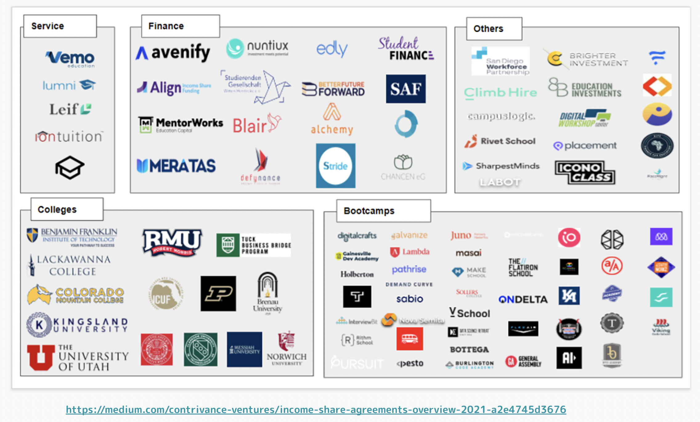 アメリカの連邦準備委員会による2020年の第三四半期における最新の報告書によると、4,470万人 を超える米国人が、総額で 1兆7000億ドル(約180兆円)もの学生ローンを借りています。アメリカでは、すでに40を超えるブートキャンプがISAを採用しており、その分野もエンジニアに限らず、UXデザイナー、インサイドセールス人材、デジタルマーケター人材、パイロット人材の育成学校など様々です。また、州立大学など公的教育機関でのISAの導入も行われています。