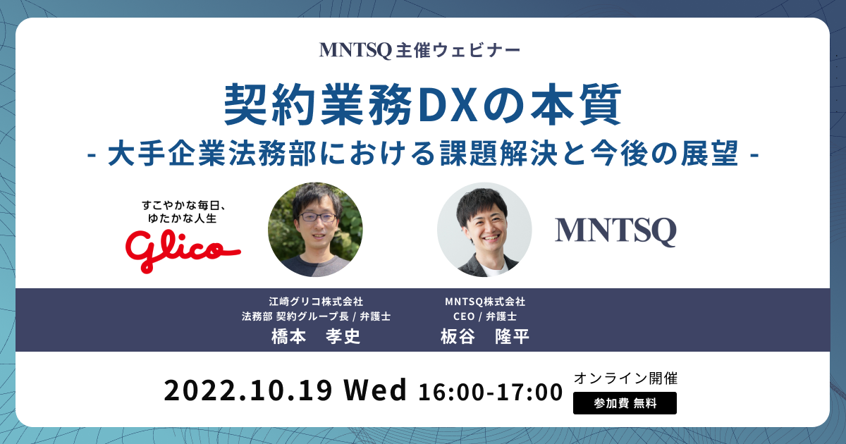 契約業務DXのMNTSQ、10/19(水)にウェビナー開催が決定!江崎グリコの橋本孝史氏をゲストに迎え、大手企業法務部のDX実践事例をお話します