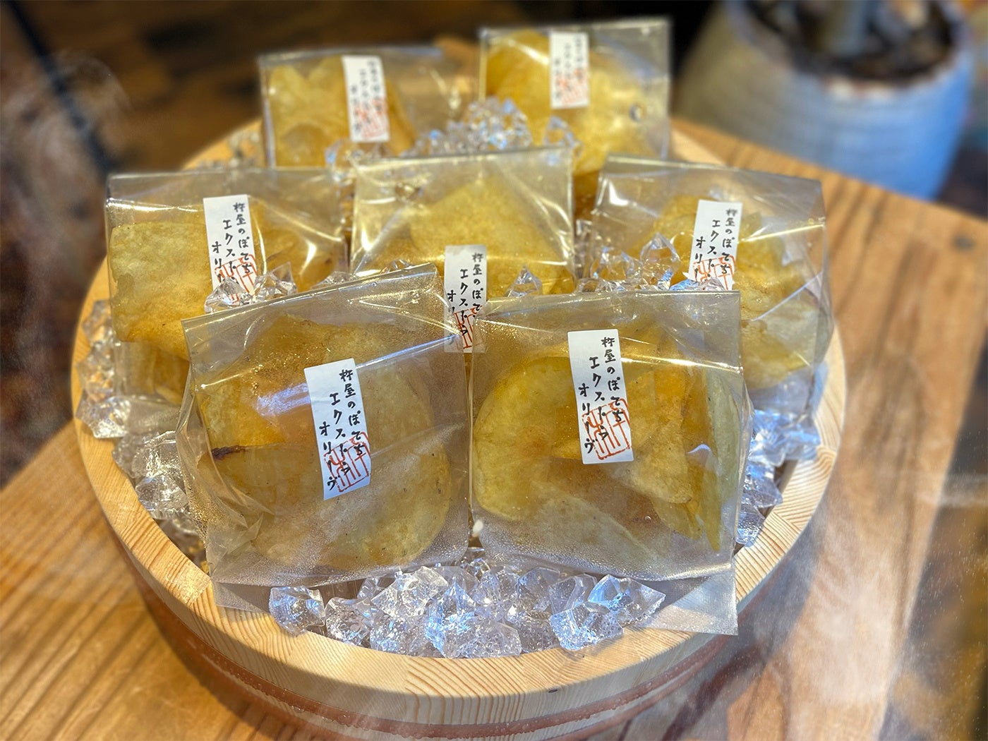 スペイン産のじゃがいもを、同国の自然農園で作られた世界最高級と評されるエクストラバージンオリーブオイルを100%使用しカリッと揚げた”杵屋のぽてち エクストラオリーブ”。