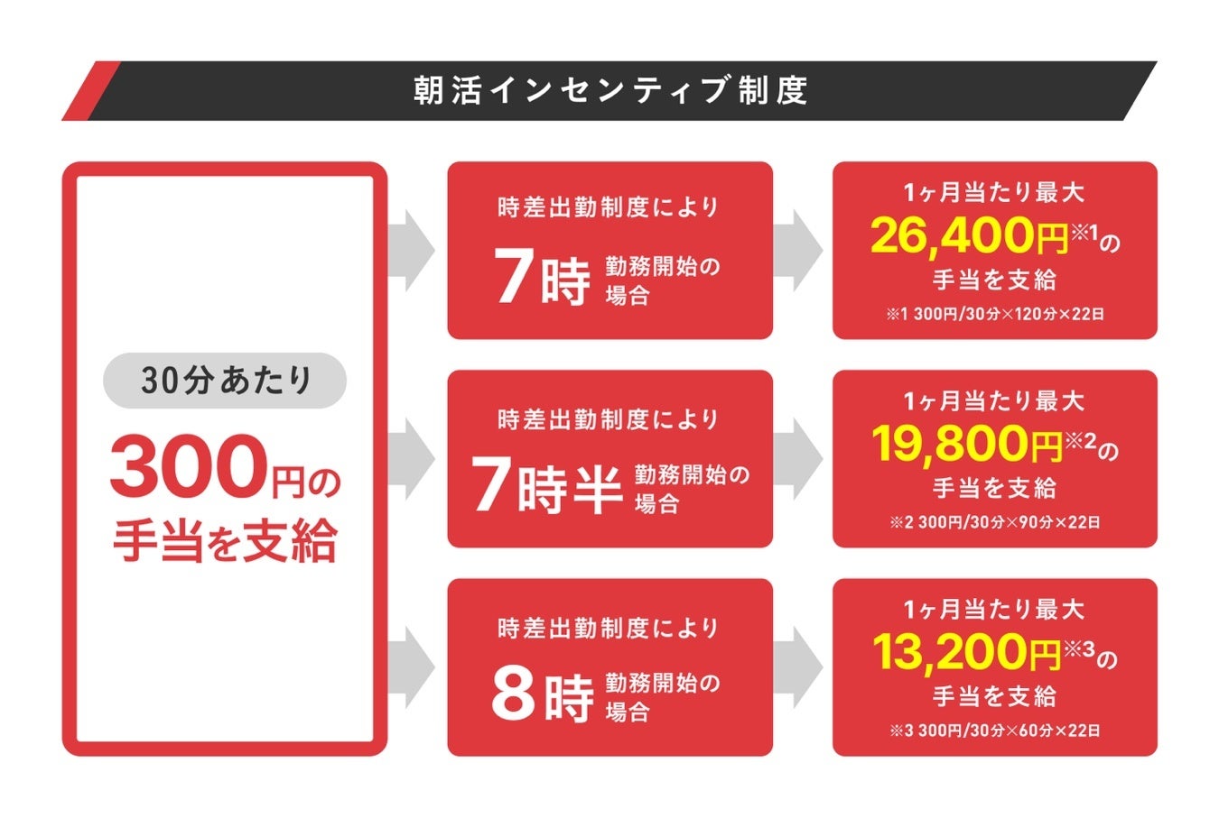 時差出勤制度利用かつ9時より前に勤務開始した場合、30分当たり300円の手当を支給します。全体的に朝方勤務へシフトすることにより、効率良くフレキシブルな働き方を実現し、全体的な労働時間の短縮を目指します。