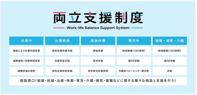 結婚・子育て・介護を機に、建築の世界を離れてしまうという人を限りなくゼロにしたい、という想いから、ライフイベント(結婚、妊娠、出産、育児、介護)に応じた勤務制度やサポート体制を整えています。産前産後・育児休暇や時短勤務、認可外保育園の差額補助(条件あり)、内閣府ベビーシッター割引券など、育児と両立しやすい労働環境づくりを推進するとともに、相談窓口を設けており、いつでも様々な相談ができる体制を整えています。