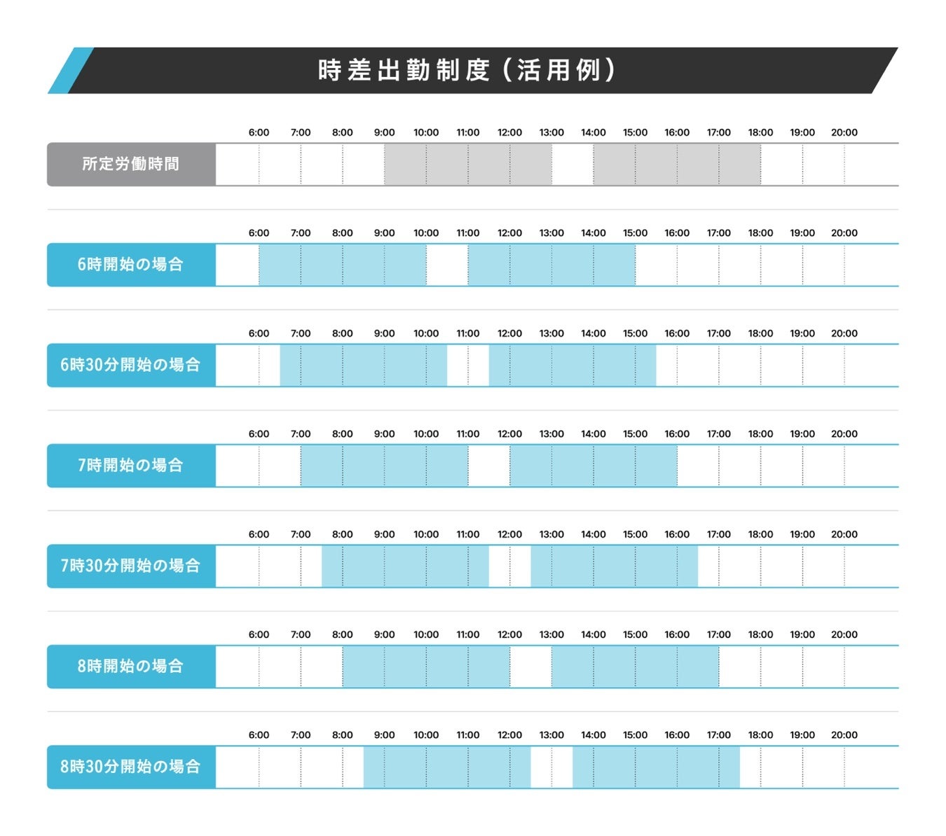 前日までの労務申請 及び 承認で、翌日の勤務開始時刻を「6時」から「8時30分」まで30分単位で選択できる制度。開始時刻に合わせて終了時刻を変動させることで、効率的な働き方を目指します。