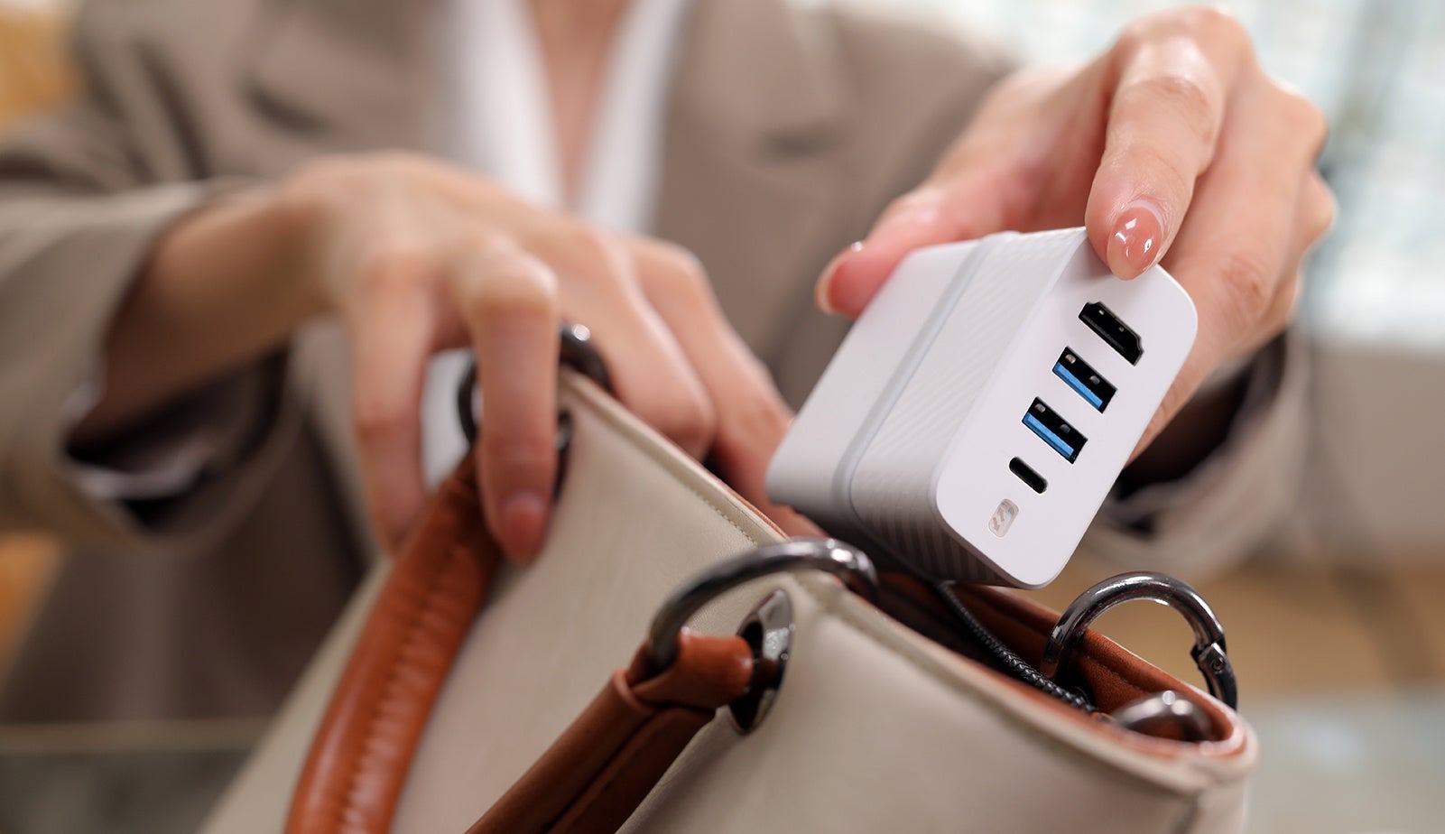 今までそれぞれ別に持ち運びや接続しなければならなかったPCアクセサリがひとつに。 鞄の中も、デスクの上もスッキリ。