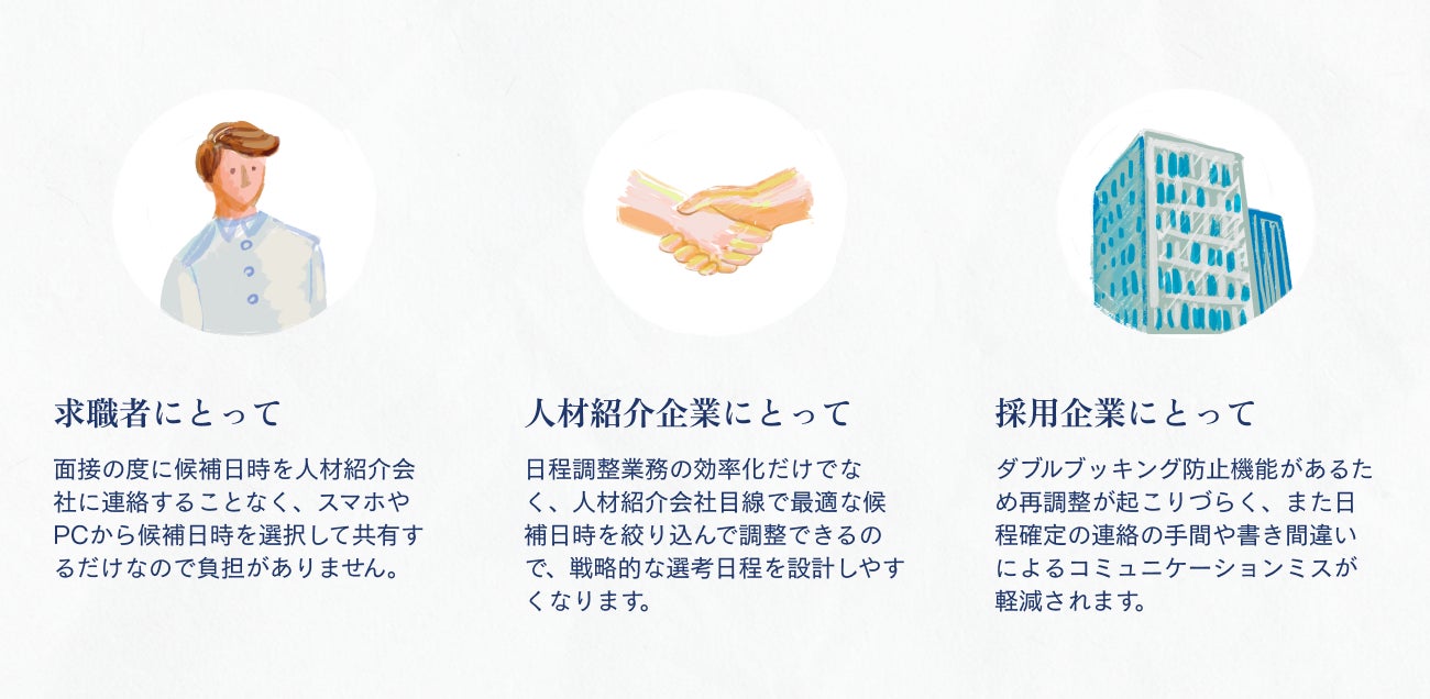 Spir for Agentは人材紹介会社の採用企業と求職者のカジュアル面談や面接の日程調整を効率化するプロダクトです。特許出願中の独自の日程調整方法により、人材紹介会社の日程調整を効率化するだけでなく、求職者や採用企業にとっても日程調整の体験が改善されます。