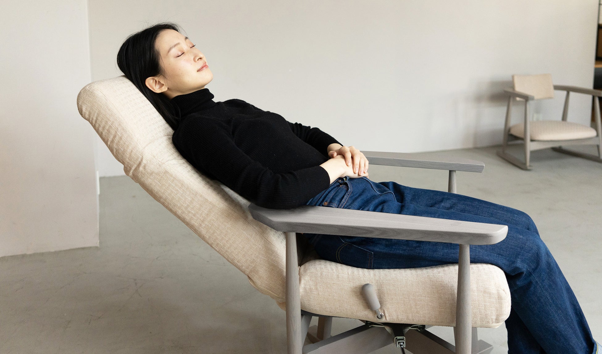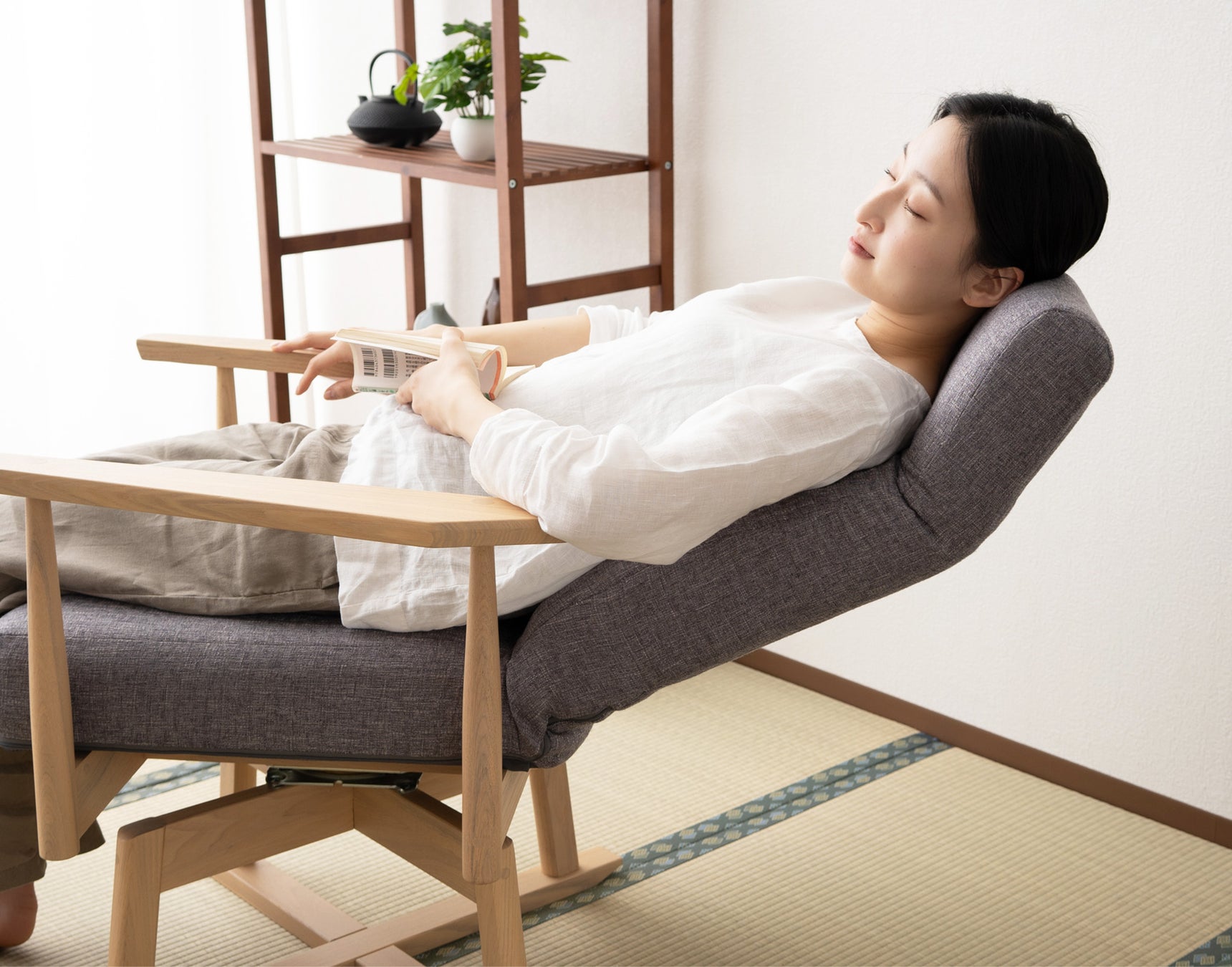 背もたれは、座面横のレバーで座ったまま操作が可能。立ち上がらず、片手で簡単にリクライニングできます。頭部・背中・腰・臀部・足裏と体圧を分散させることで、長時間でも快適にお過ごしいただけます。