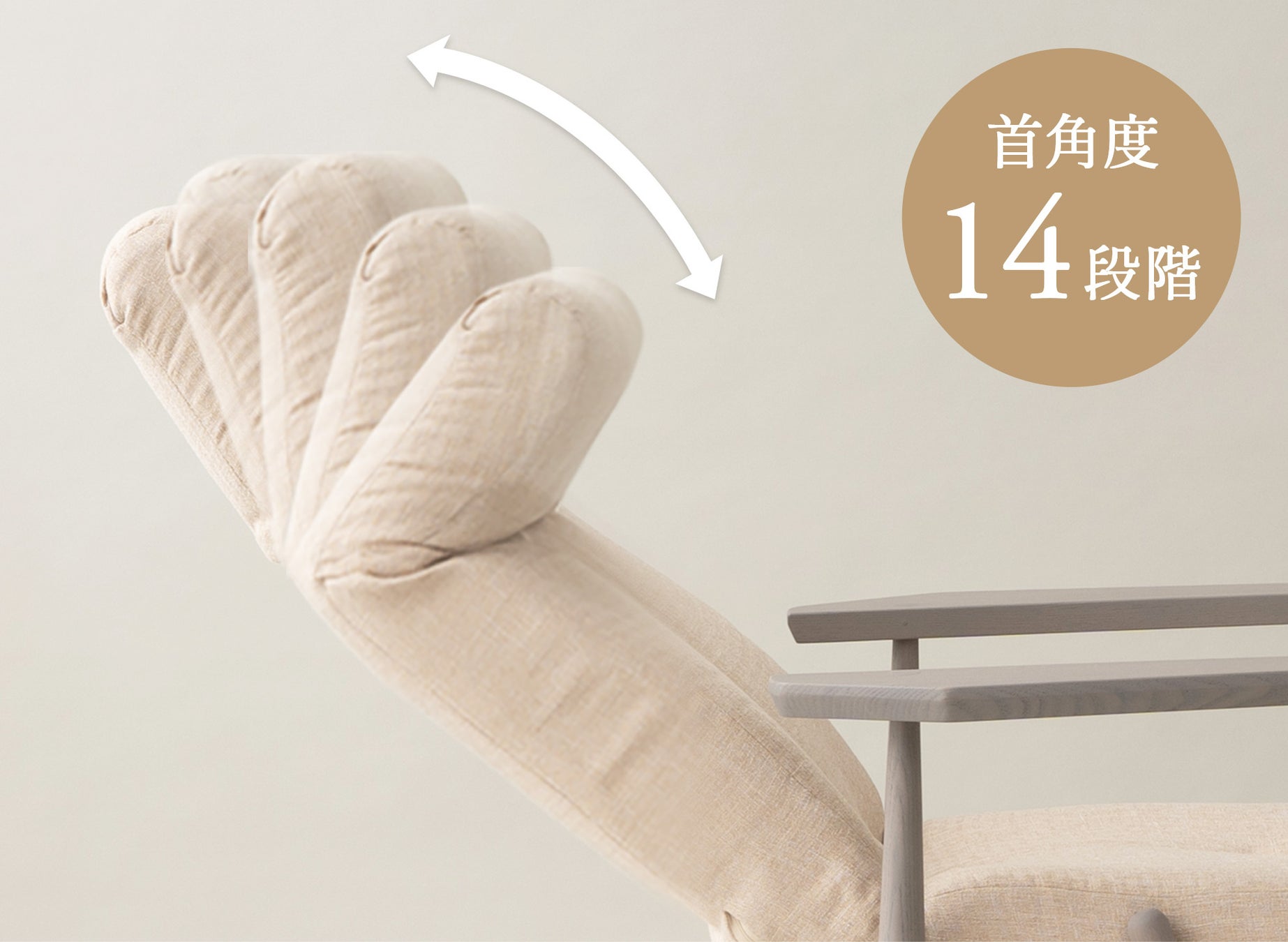 ヘッドレストは手動のギア式で、14段階に調節が可能。読書中、お昼寝など、シーンに合わせてお好みの角度に。