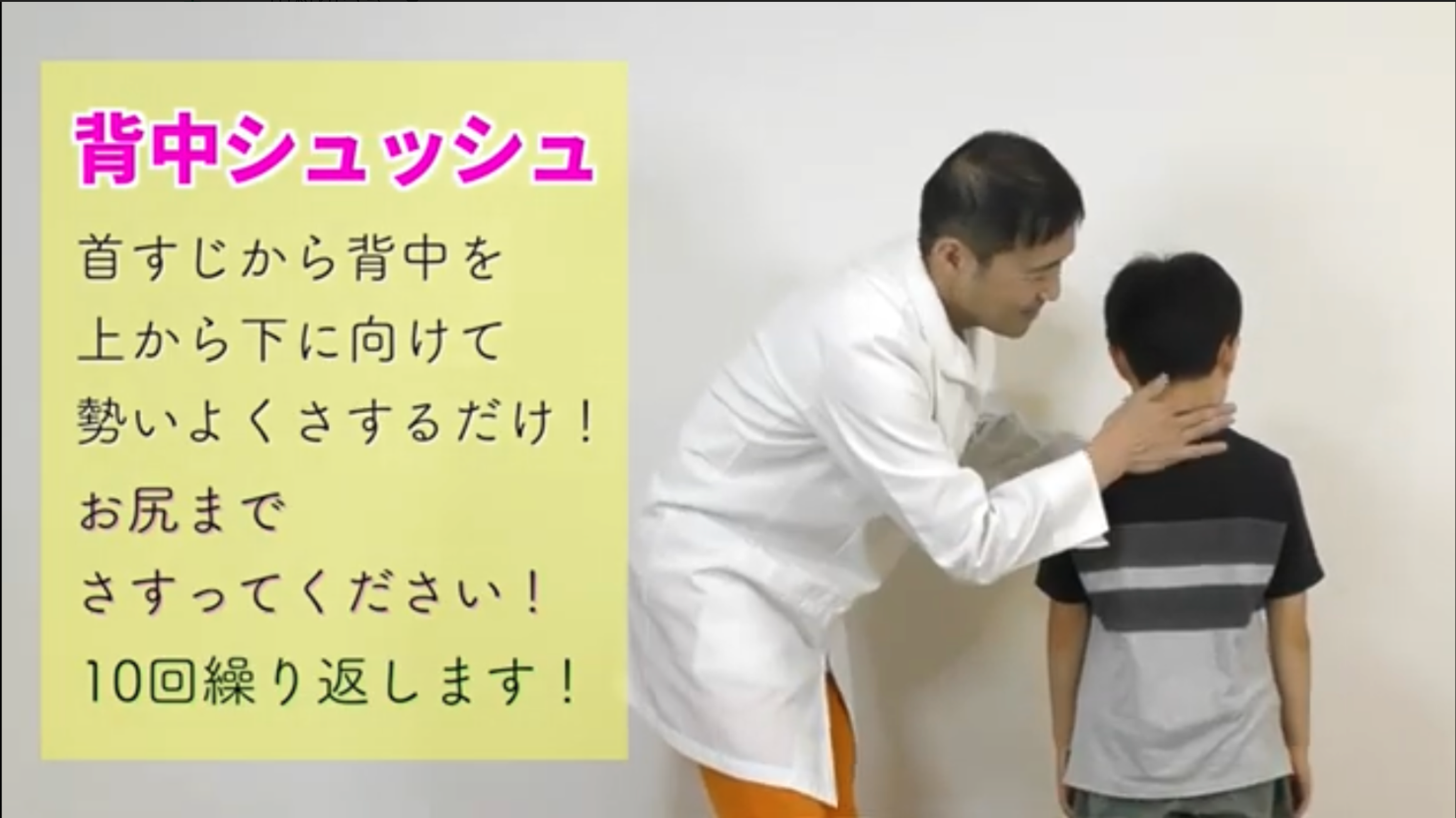 立っている子どもの背中を、大人が片手で上から下に「強め」に10回”さする”だけです。コツは、強めの力で首の付け根からお尻に勢いよく「シュッ!シュッ!」とさすることです。