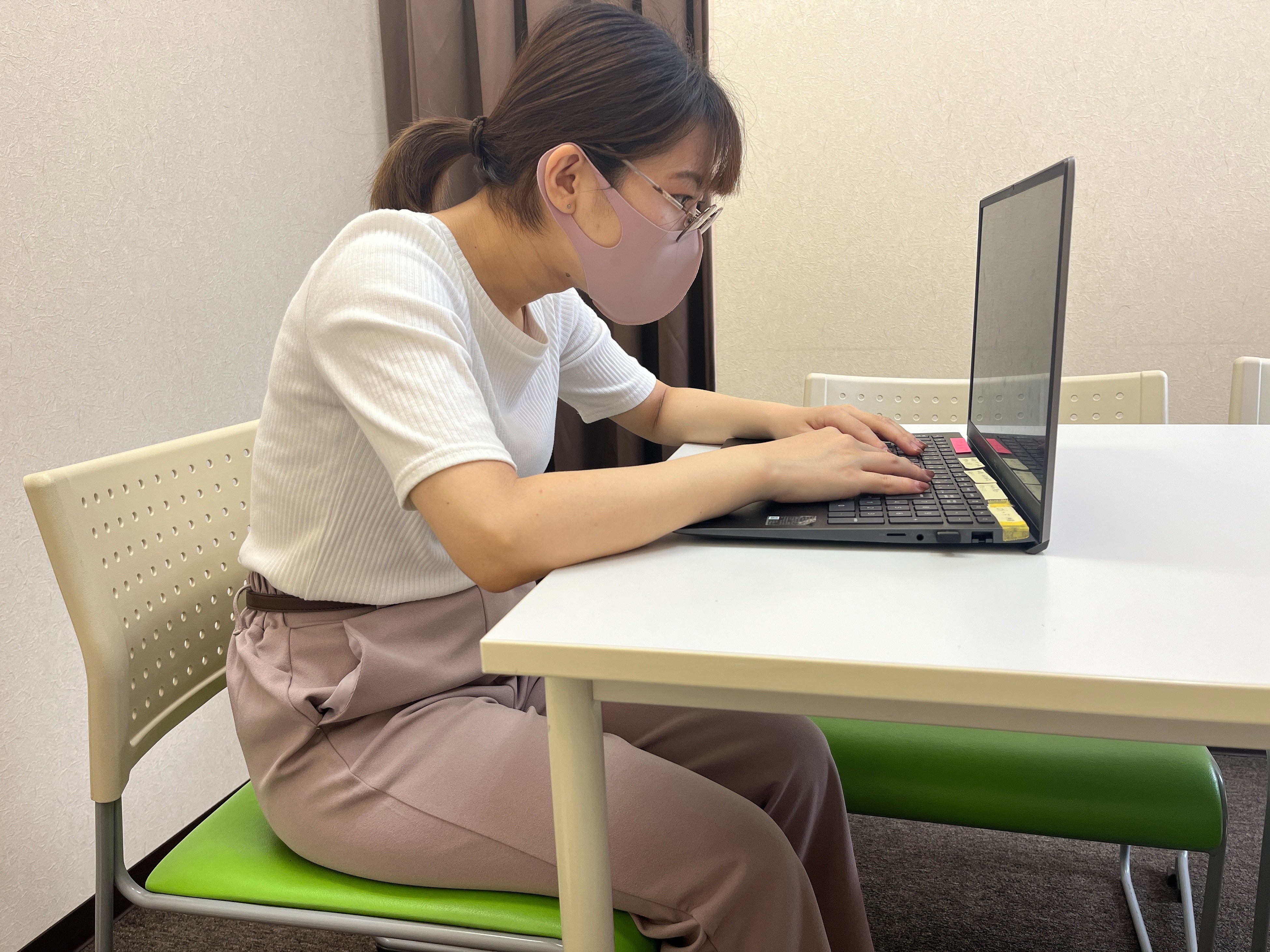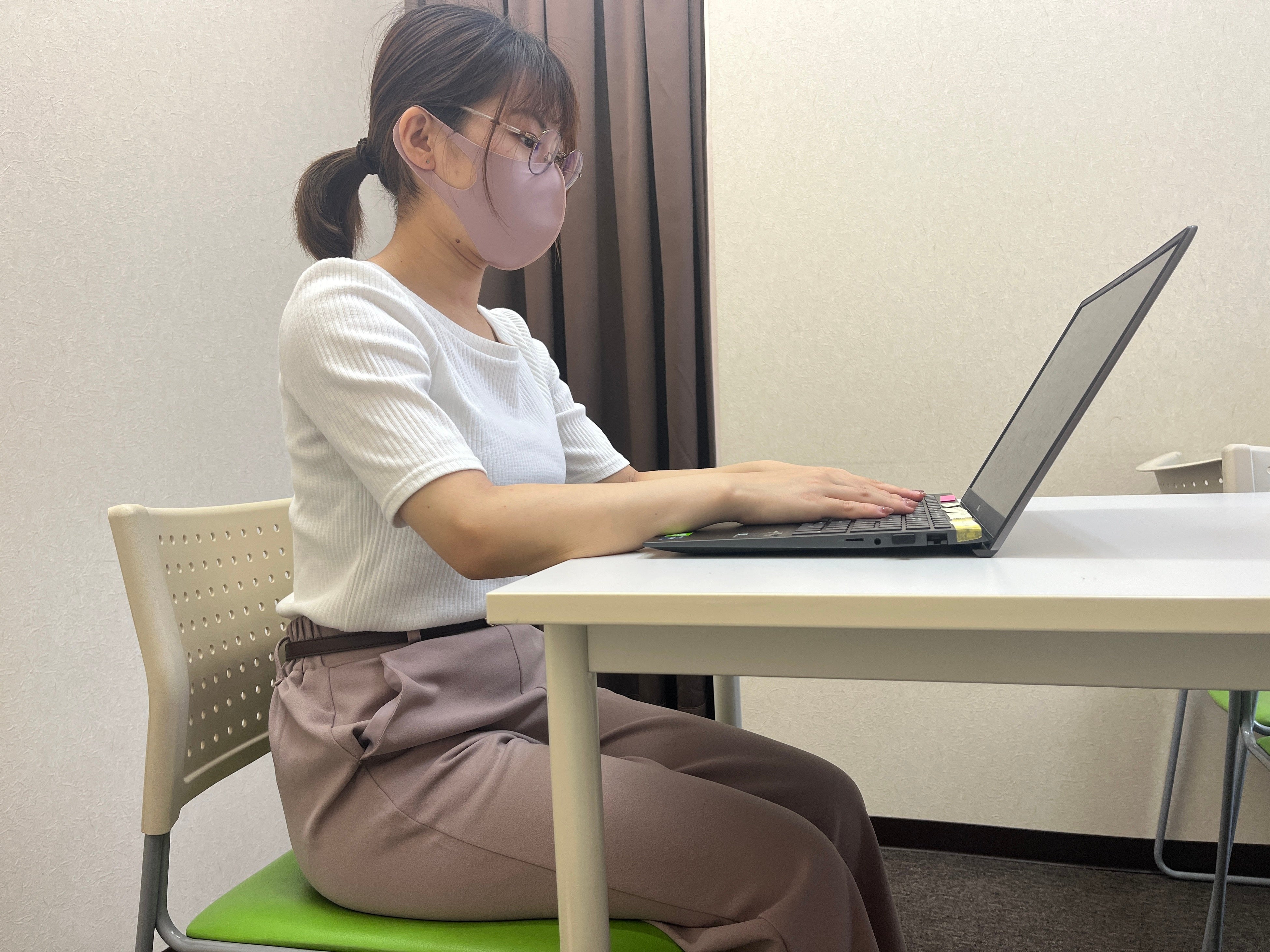 同時に、机のふちに前腕を当てて、体が前に倒れ込むのをロックします。そうするとひどい姿勢になることを防ぐことができます。