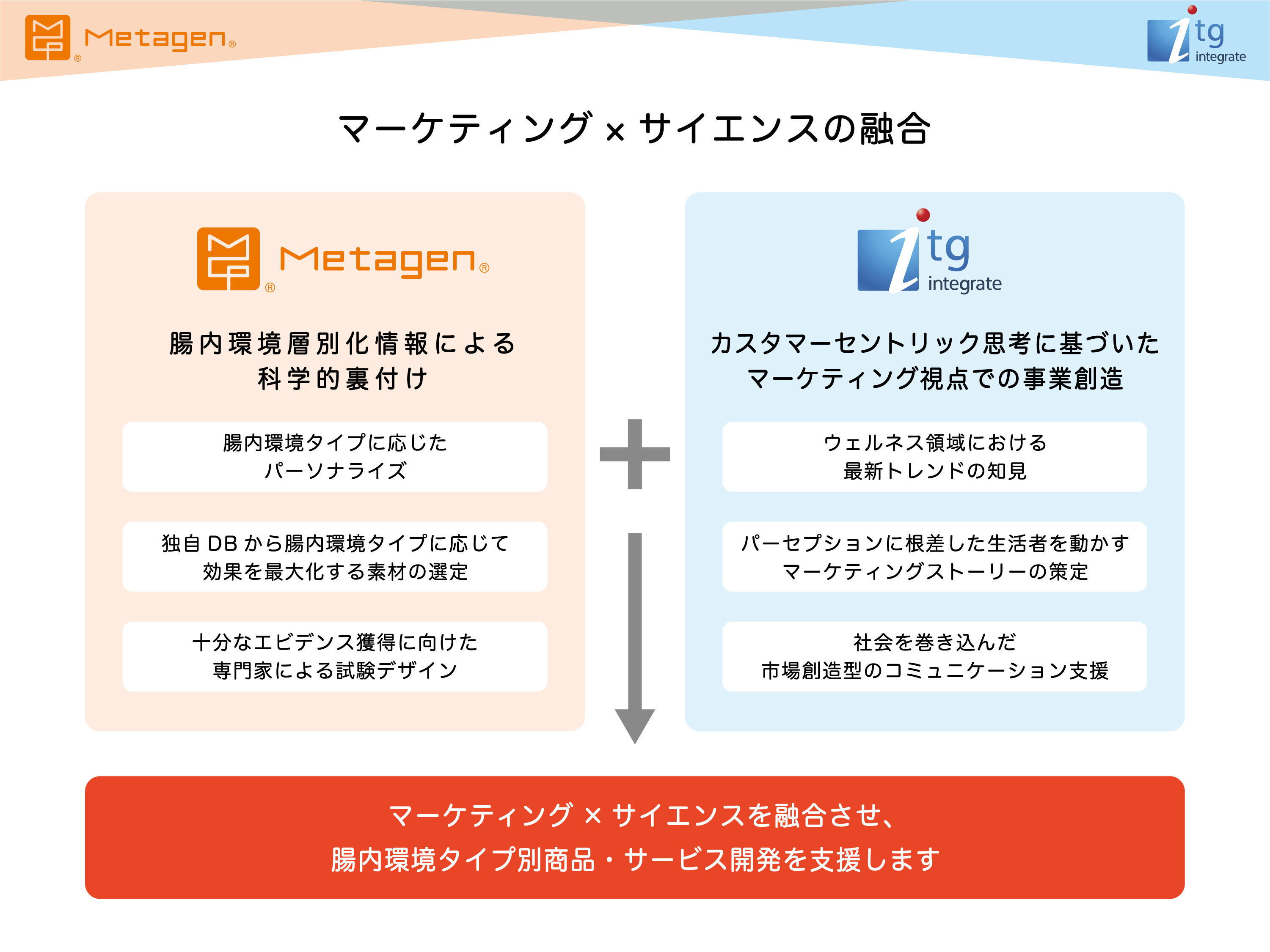 最先端科学に基づき腸内環境を制御する「腸内デザイン®︎」をコンセプトに、人それぞれの腸内環境タイプに合わせたアプローチを推進しているメタジェンと、10年以上に渡りヘルスケア食品・飲料の事業戦略からマーケティング戦略・実行支援まで一気通貫でサポートを行ってきたインテグレートとが一体となって取り組むことにより、「消費者それぞれの身体にあった効果の期待できる商品設計」「その商品が必要であると消費者に気づいてもらえるコミュニケーション展開」を可能とし、顧客満足度の向上を実現します。