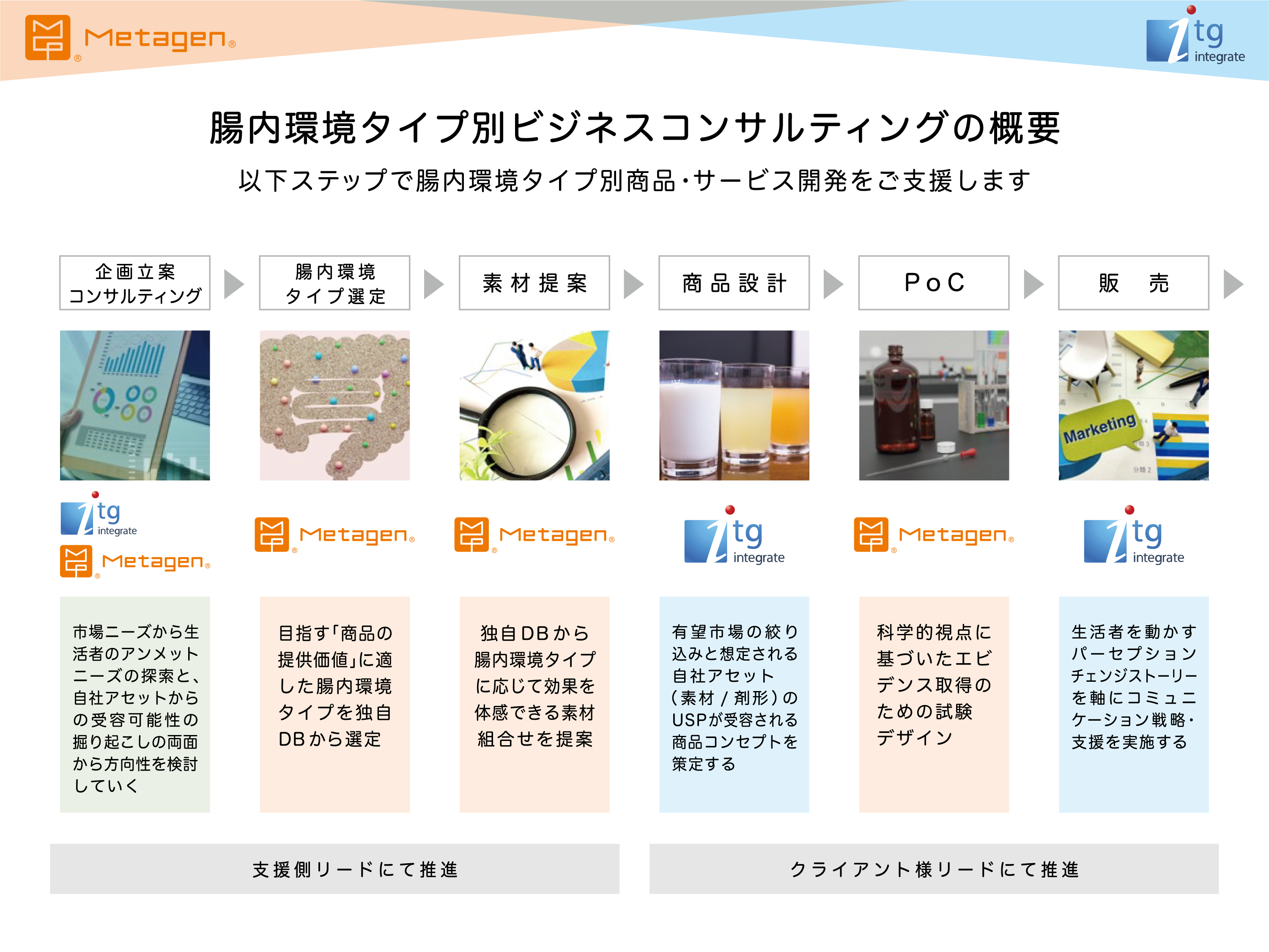 株式会社メタジェン(本社:山形県鶴岡市、代表取締役社長CEO・CGDO:福田真嗣、以下、メタジェン)、株式会社インテグレート(本社:東京都渋谷区、代表取締役CEO:藤田康人、以下、インテグレート)は、最先端の腸内環境研究からわかってきた腸内環境情報を活用し、人びとの腸内環境タイプを考慮した「商品・サービス開発」、「ビジネス戦略設計」、「マーケティング戦略の立案と実施」を一気通貫で支援する「腸内環境タイプ別ビジネスコンサルティング」の提供を開始いたします。