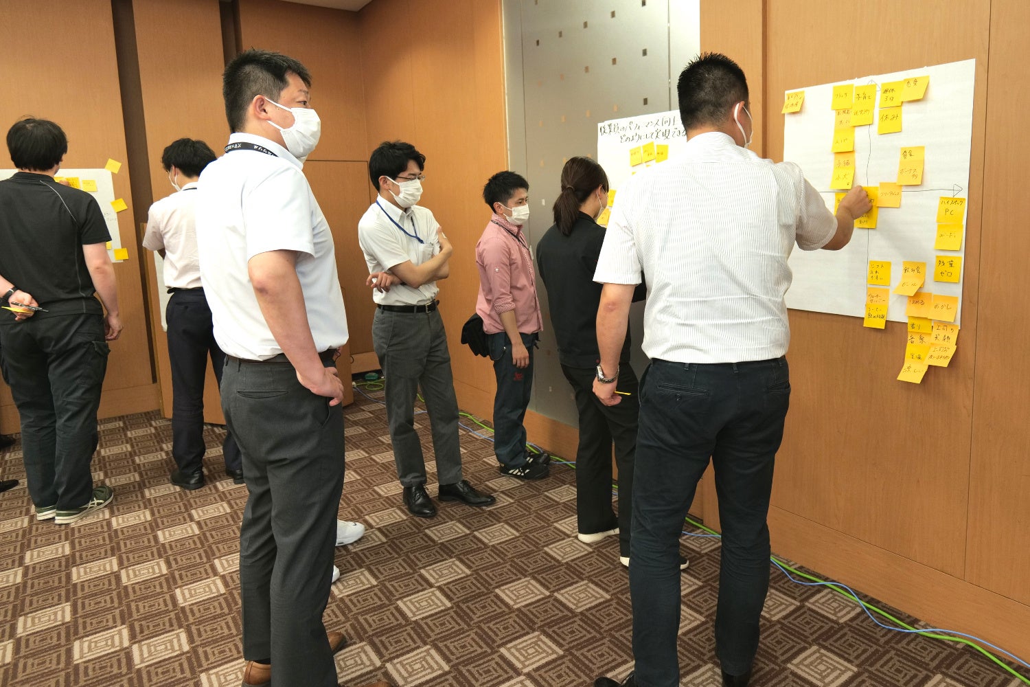 その後、「東京ドームが想像する未来の宇宙ビジネスとは?」をテーマに、ワークショップを実施しました。6チームに分かれ、それぞれが設定した問いに対して、システム思考やデザイン思考の考え方にもとづき、CVCA(Customer Value Chain Analysis:顧客価値連鎖分析)や体験スケッチボードなどを活用して議論を進めました。