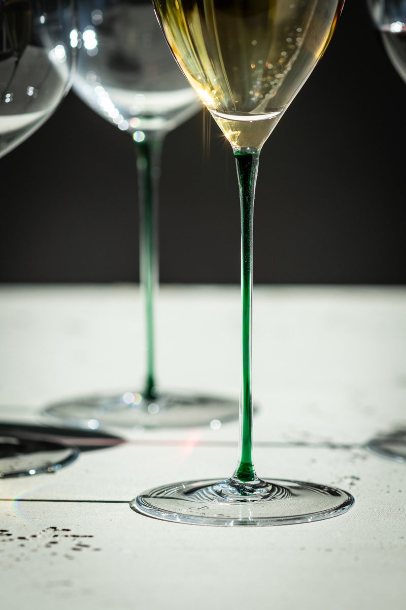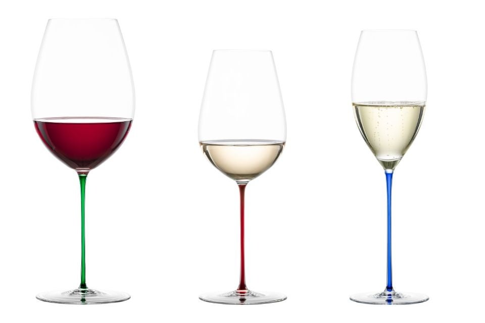 本シリーズは、シャンパン用・赤ワイン用・白ワイン用の3つの形状を採用。そして、ステム(脚部)には「ベリルグリーン」「チェリーレッド」「ライトブルー」という3色のカラーバリエーションを