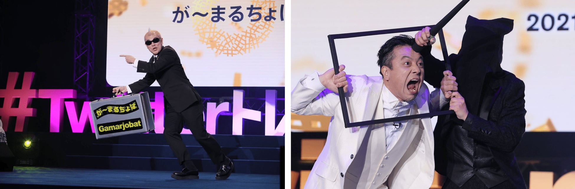 続いてが~まるちょばさんと共に東京五輪開会式で“動くピクトグラム”のパフォーマンスを披露し話題となったGABEZさんが登場。今年のトレンドワードをパントマイムで表現する「Twitterトレンドワードパフォーマンス」を披露してくれました。GABEZさんは「今年は、オリンピックとが~まるちょばさんのおかげで今年があったような感じですので、来年は自分たちの力で何か爪痕を残して、いい年にしたいと思います。」とコメントしました。