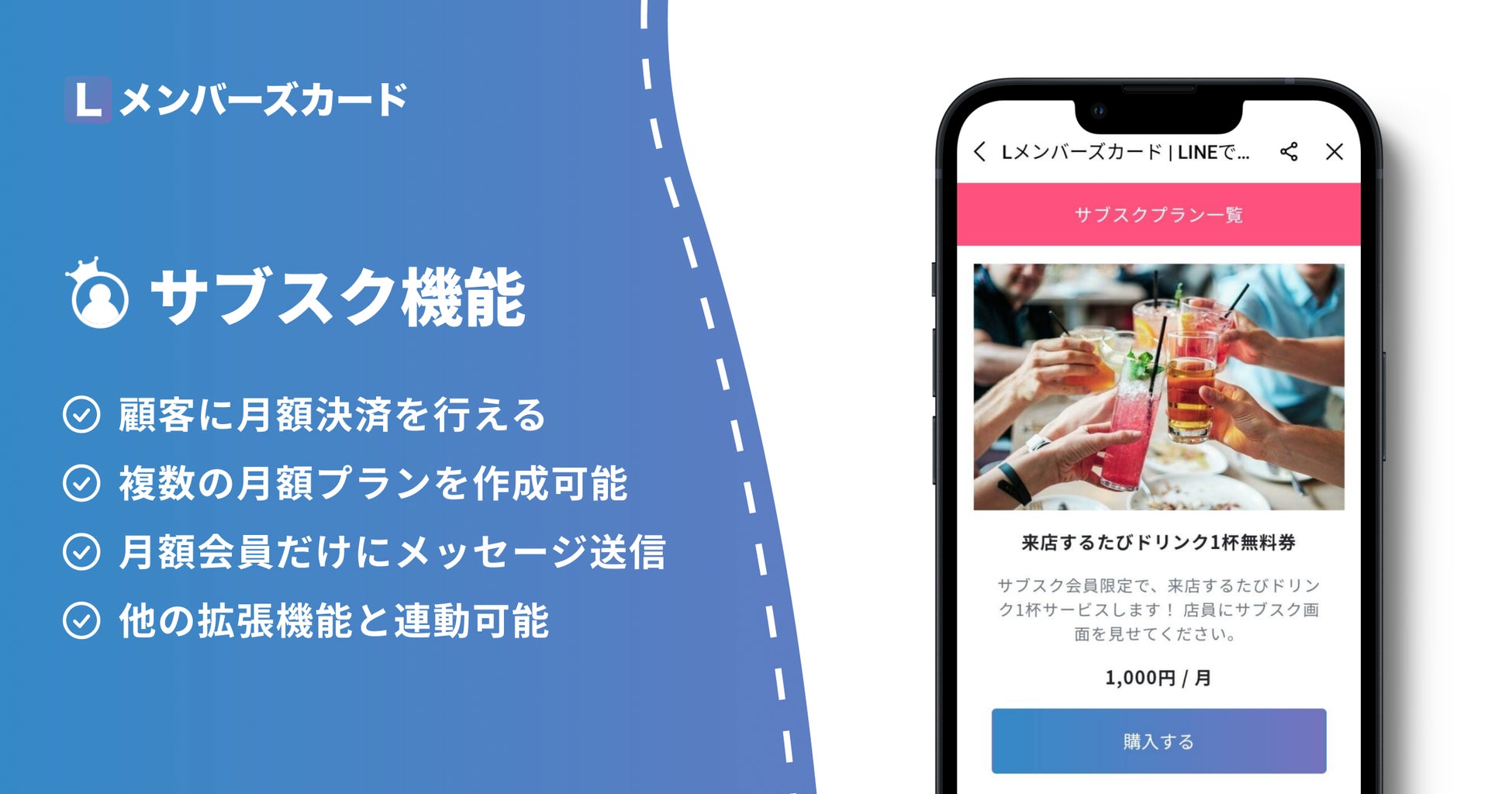 Lメンバーズカードの拡張機能として利用いただけるサブスク機能では、クレジットカード決済で月額課金の導入が可能です。具体的には、以下のことができるようになります。