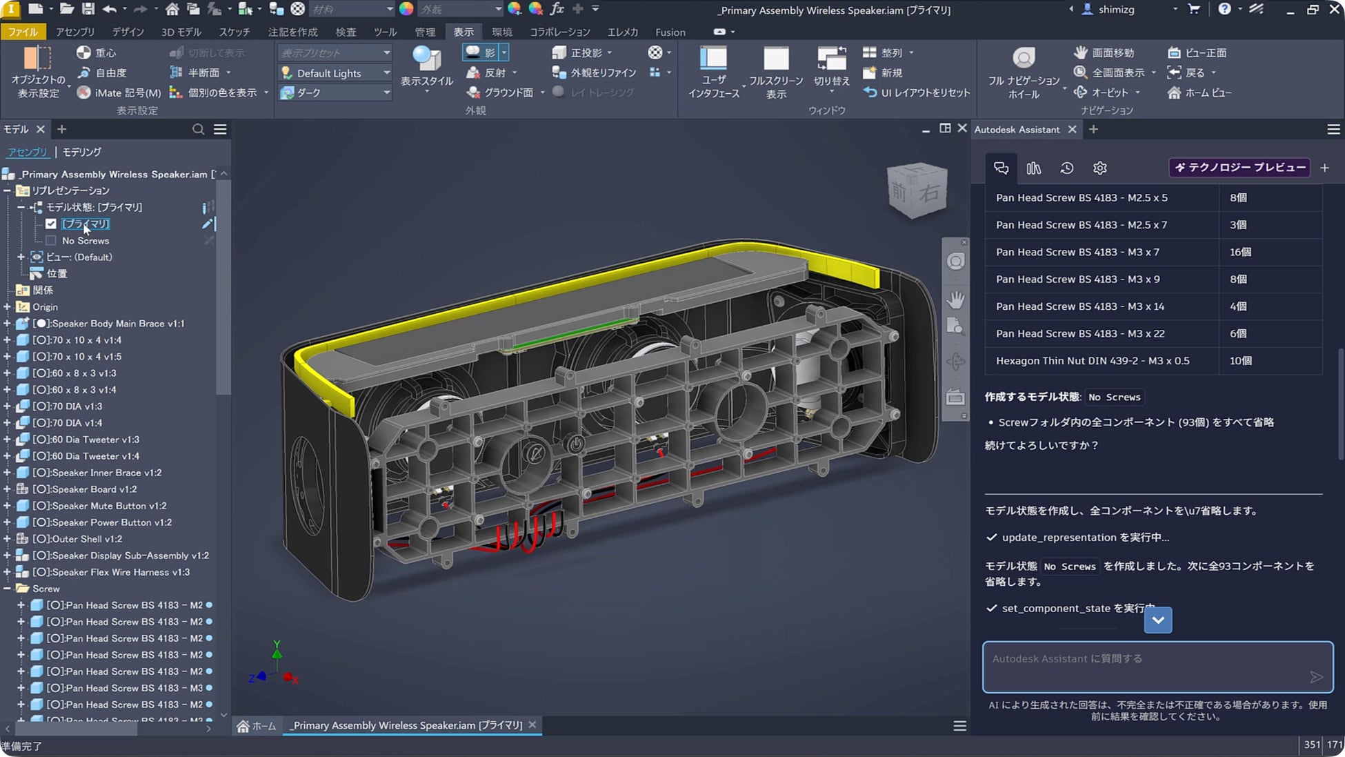 Inventor 2027 では、新たに AI エージェント「Autodesk Assistant」(テクノロジープレビュー)を搭載しました。本機能は、設計者が “質問する・指示する” だけで結果を得られる新しい操作体験を提供します。