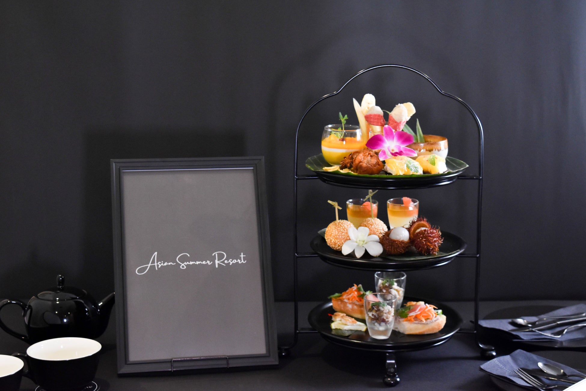 1段目は誰もが知る東南アジア原産の南国フルーツを日本でもお馴染みのアジアンスイーツにアレンジ。彩り鮮やかに仕上げました。