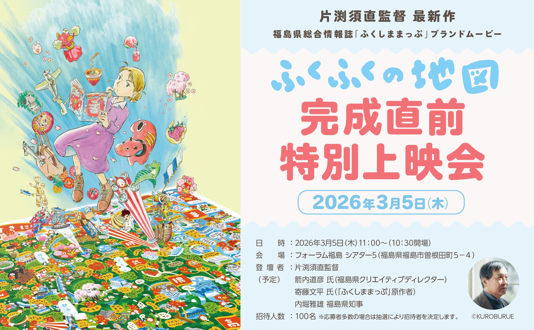 福島県は、片渕須直監督による完全オリジナル短編アニメーション「ふくしままっぷブランドムービー『ふくふくの地図』」の公開を前に、2026年3月5日(木)に完成直前特別上映会を開催します。