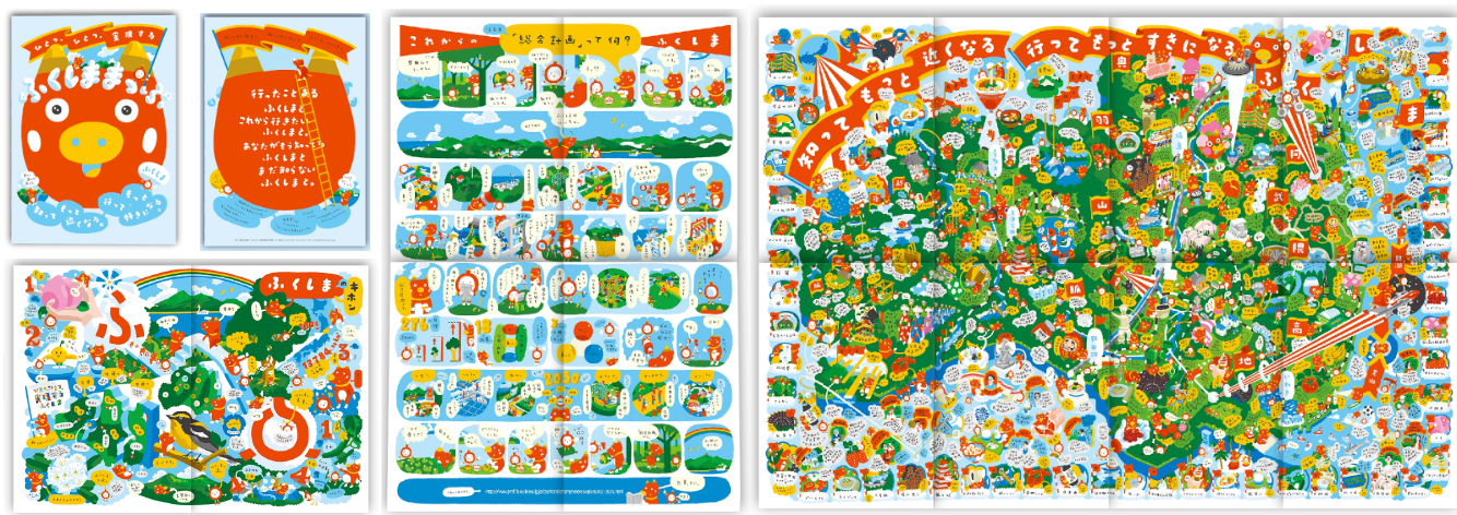 写真を一切使用せず、大人から子どもまで親しみやすい、手描きのイラストと文字だけで構成された折りたたみ式の総合情報誌。200を超える名所、伝統行事、特産品、海、川、山、湖から、人々の活動や声まで、福島の魅力をひとつひとつ手描きで絵に描いてこれでもかと一枚に詰め込んでいます。2016年の発行から、累計発行部数は50万部を突破しました。