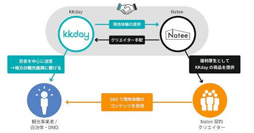 今回、Natee契約のTikTokクリエイターにKKdayで販売されている日本国内の現地体験を福利厚生の一環として割引または無料で提供し、多くのクリエーターに日本各地の観光スポットなどを体験して頂くことで、動画コンテンツを活用した魅力発信により、若者を中心に地方への送客を実現し、地方活性化に繋げます。