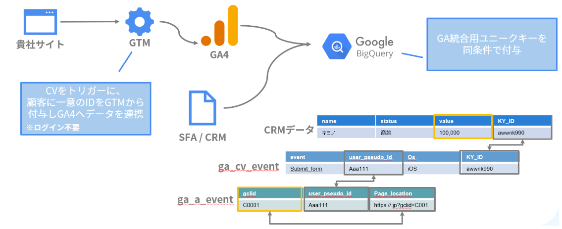 これにより各媒体のclidと顧客毎の営業パイプラインステータス等(通電、商談、成約、継続など)を紐づけることが可能となります。clidと営業ステータスを紐づけて広告媒体にインポートすることで、広告媒体はCV毎のバリューを学習し、バリューに合わせた広告の最適化が働き始めます。