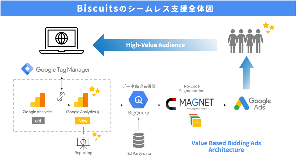 先日、GA4 / 拡張コンバージョン / sGTM / 1stPartyデータ活用広告 の実装をトータルサポートすることでVBBを推進する「ビスケット・パッケージ」をリリースいたしましたが、この度の「ROASタグ」を新たにビスケット・パッケージに加えることにより、より一層広告の本質的な最適化が強化される形となりました。