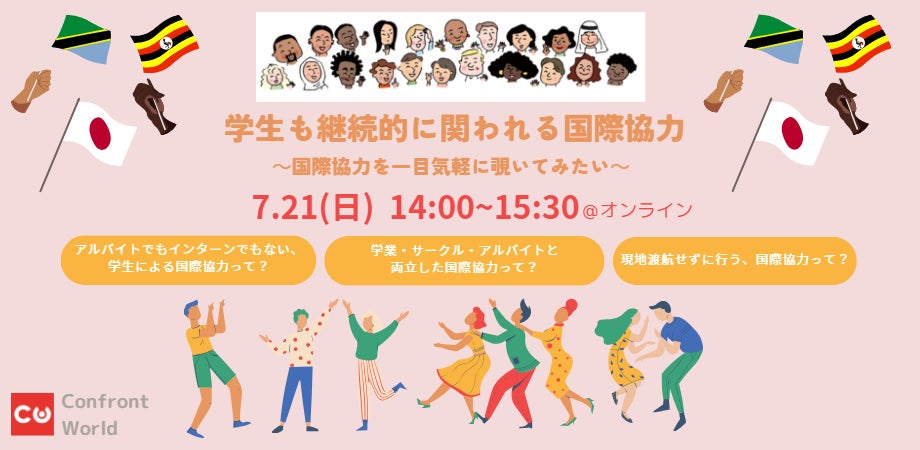 アフリカ農村部で生活と権利の保障を目指すNPO法人コンフロントワールド(東京都港区、代表理事:荒井昭則)は、「学生も継続的に関われる国際協力 ~国際協力を気軽に一目覗いてみたい~」を開催します